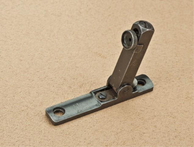 King Improved Tang Peep Sight with one piece elevator which a micro metered click adjustment for elevation. The elevator stem is easily unlocked by pressing down on the small spring at the base of the elevator. Fine condition. Est. $500-1,000