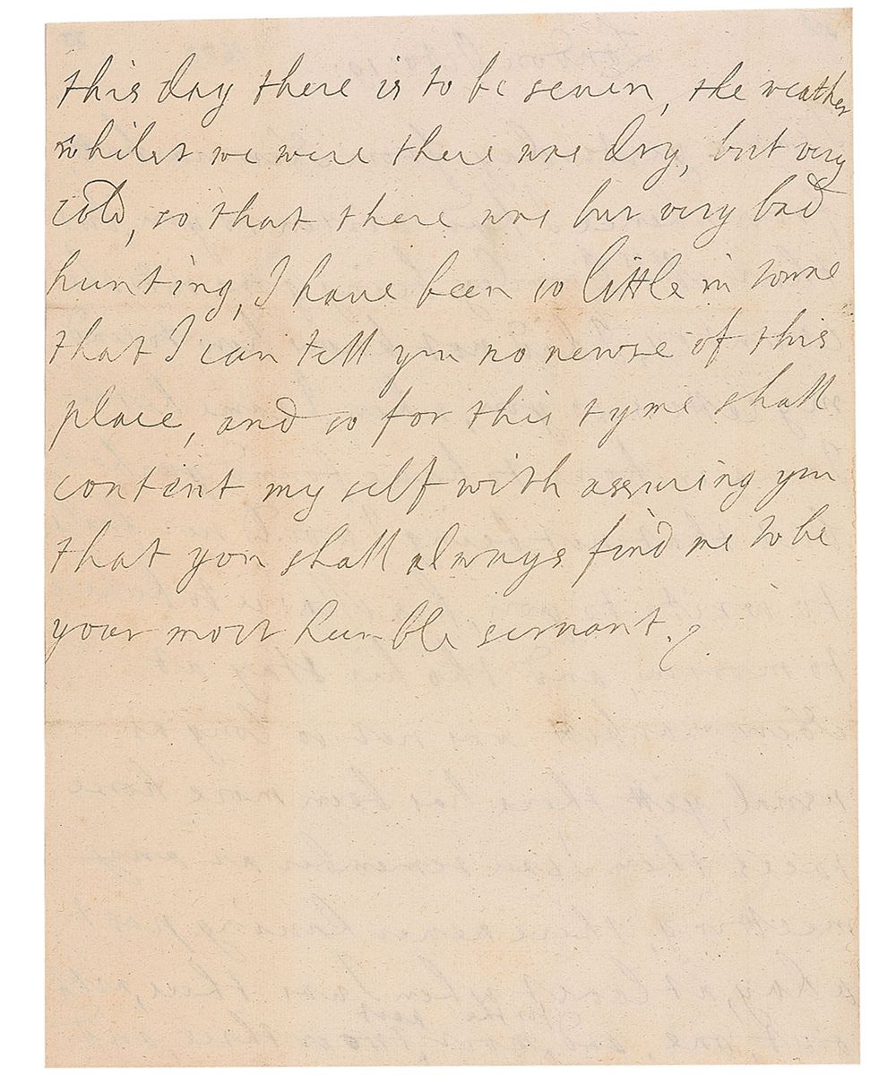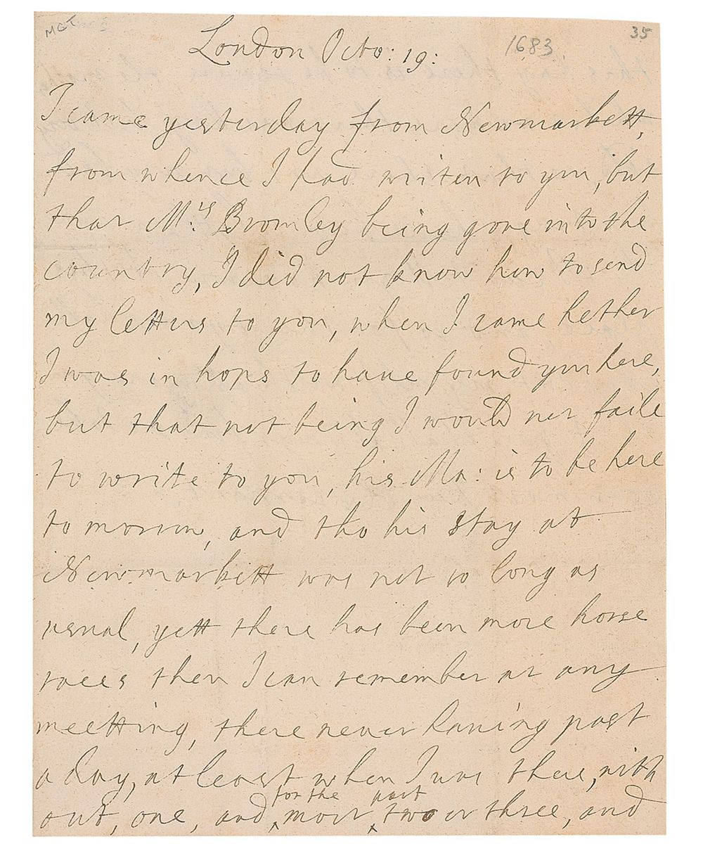 Autograph letter [not signed], one page both sides, 6.75 x 9, October 19. Letter to the Countess of Litchfield. In part: “I came yesterday from Newmarket from whence I had written to you, but…Mr. Bromley being gone into the country, I did not know how to send my letters to you, when I came hither I was in hopes to have found you here, but that not being I would ner faile to write you.” Reverse of second integral page bears an address panel in another hand. Intersecting folds, a few small pencil notations, and some light toning, otherwise fine condition.