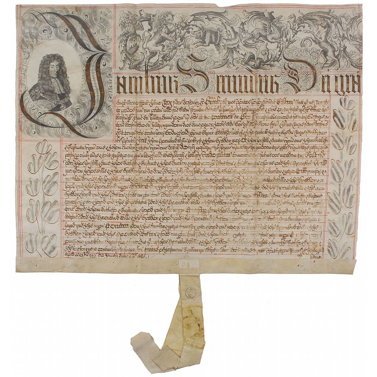 The last Catholic monarch (1633–1701) to reign over the Kingdoms of England, Scotland, and Ireland, crowned in 1685. Unsigned vellum manuscript document from the reign of King James II, one page, 27.5 x 20.75, no date but circa 1685–1687. An appealing document printed with an ornate border featuring an image of King James in the upper left, as well as foliage and creatures such as a dragon, unicorn, lion, and serpent. In part: “Know Ye that among the records and Feet of the Fines with the proclamations thereof made according to the form of the Statute in that case lately enacted.” In very good condition, with heavy intersecting storage folds, scattered soiling, and some rubbing to lettering.