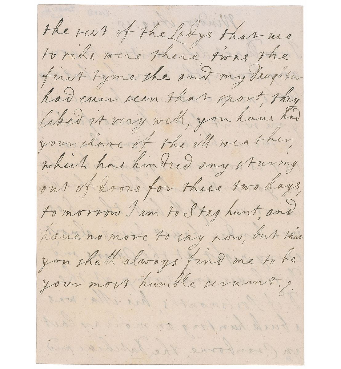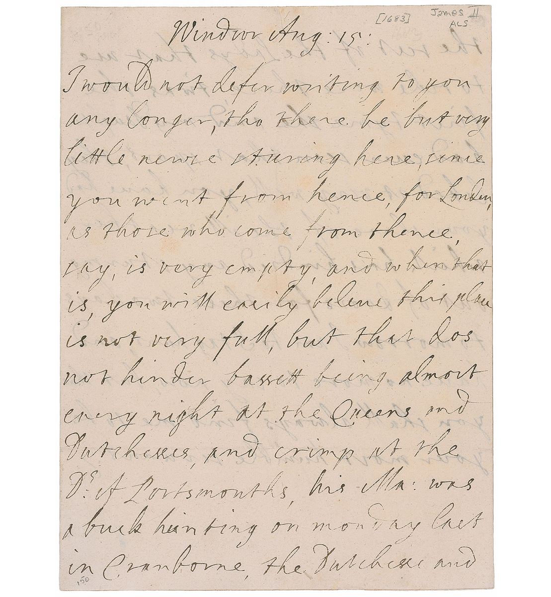 The last Catholic monarch (1633–1701) to reign over the Kingdoms of England, Scotland, and Ireland, crowned in 1685. ALS signed “J,” one page both sides, 6.5 x 8.75, August 15, no year but notated 1683. Letter to his niece Charlotte Fitzroy, the illegitimate daughter of Charles II. In part: “You will easily believe this place is not very full, but that does not hinder bassett being almost every night at the Queens and Dutchesses, and crimp at the Ds. of Portsmouths, his Ma: was buck hunting on Monday last in Cranborne, the Dutchesse and the rest of the Ladys that use to ride were there, t’was the first tyme she and my daughter had ever seen that sport, they liked it very well…tomorrow I am to stag hunt.” In fine condition, with intersecting folds and light show-through from writing to opposing sides.