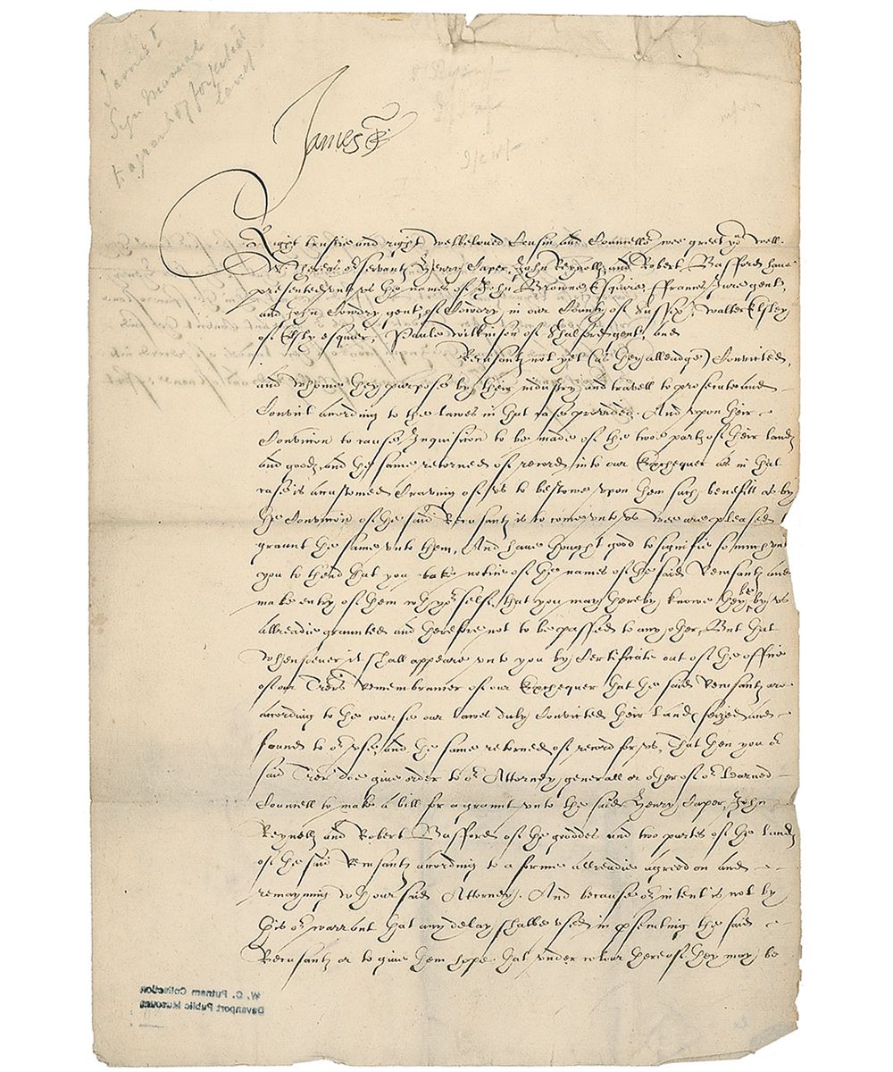 King of England and Ireland (1566–1625) under whom the ‘Golden Age’ of Elizabethan literature and drama continued. Manuscript DS in Latin, signed “James R,” one page both sides, 8 x 12, no date. Untranslated document granting forfeited land, boldly signed at the top by the king. In very good condition, with scattered edge wear, chipping and creasing, and pencil notations to top left. Document also bears a W. C. Putnam Collection, Davenport Public Museum stamp on the reverse showing through in the lower left corner. Documents signed by this historic monarch are rarely encountered.