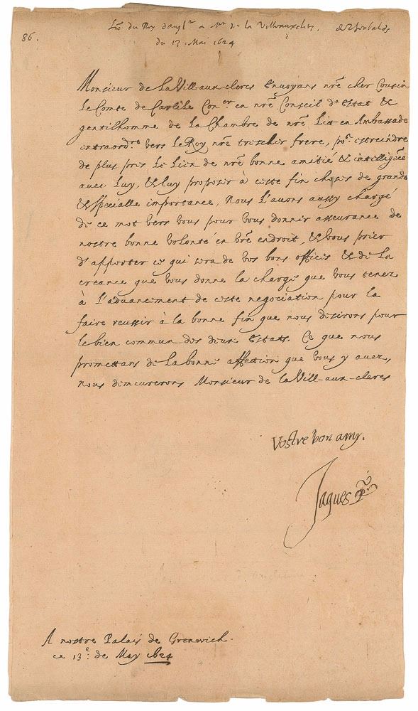 King of England and Ireland (1566–1625) under whom the 'Golden Age' of Elizabethan literature and drama continued, and who famously sponsored the translation of the Bible into English. LS in French, signed “Vostre bon amy, Jacques,” one page, 7.25 x 12.75, May 13, 1624. Letter to M. de la Ville-aux-Clercs, in part (translated): "Our dear cousin the Earl of Carlisle, Counselor in Our Council of State & gentleman of Our bedchamber, being on an extraordinary mission to the King, Our very dear brother, to further tighten the bonds of our good friendship & intelligence with him & to propose to him things of great & special importance to this end, we have also charged him with this word to you, to give you assurance of our good will on your part, & ask you to use your good offices & give credence to the charge you have of advancing this negotiation so that it may come to a happy conclusion, which we desire for the common good of the two states." In fine condition, with a light seal-related stain to the top; the integral address leaf, which contains the seal, is detached but present.