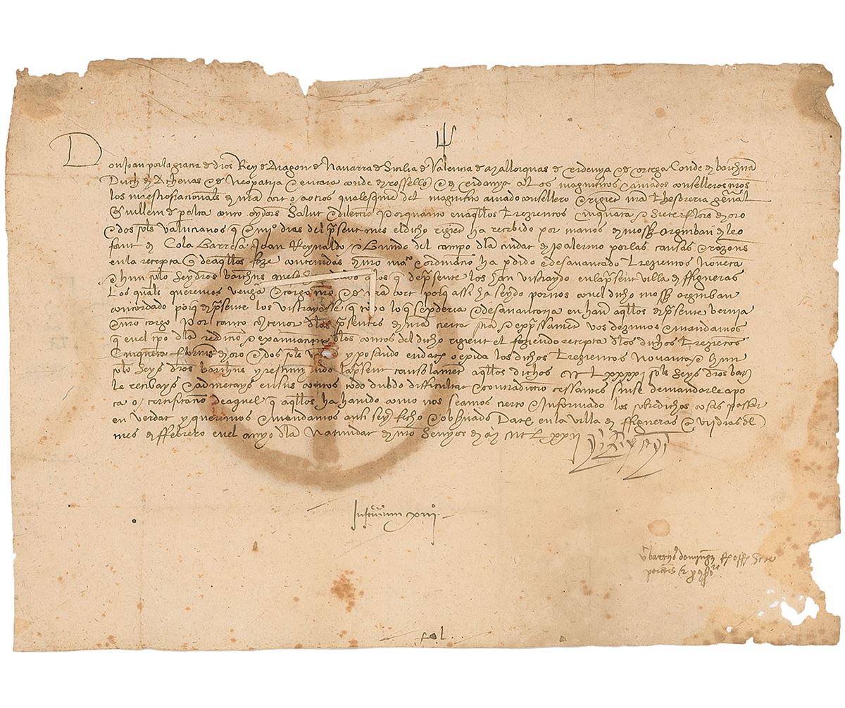 Son of Ferdinand I and Eleanor of Alburquerque known as John II the Faithless, as well as John II the Great (1398–1479), who ruled as king of Aragon from 1458 to 1479. Manuscript DS in Spanish, one page, 12 x 8.5, February 7, 1472. Document submitted to the councilors of the city of Figueras in which the king declares that Guillem de Peralta, his treasurer, who lost to a careless bearer 391 gold florins, should not be held responsible for this sum in his accounts. Overall foxing and soiling, some paper loss and dampstaining to edges, and a large circular area of toning to the center from a seal affixed to the reverse, otherwise very good condition.