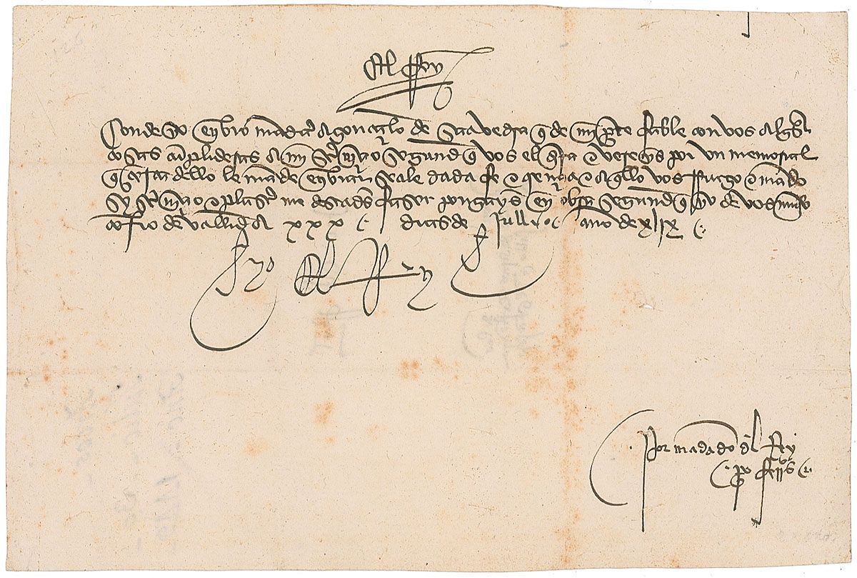 King of Castile from 1406 to 1454. LS in Old Spanish, signed “Yo el Rey” (I the King), one page, 8.5 x 5.75, July 31, 1449. The King writes to Juan Perez Ponce de Leon, 2nd Count of Arcos, a member of his Council, that he is sending him news by his trusted envoy, Gonzalo de Saavedra, “who on my behalf will speak with you about some pressing things that he will tell you about which you will read in a draft document I ordered him to send you…I beg and order you, if service and pleasure you wish to render me, that you get this work underway in accordance with all the confidence I have in you.” Intersecting folds, a few small pinholes, light show-through from docketing on reverse, and scattered light toning and foxing, otherwise fine condition.