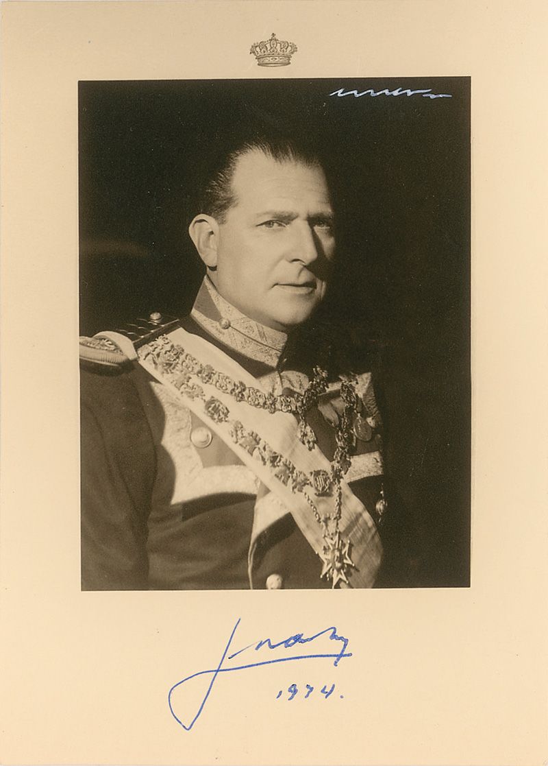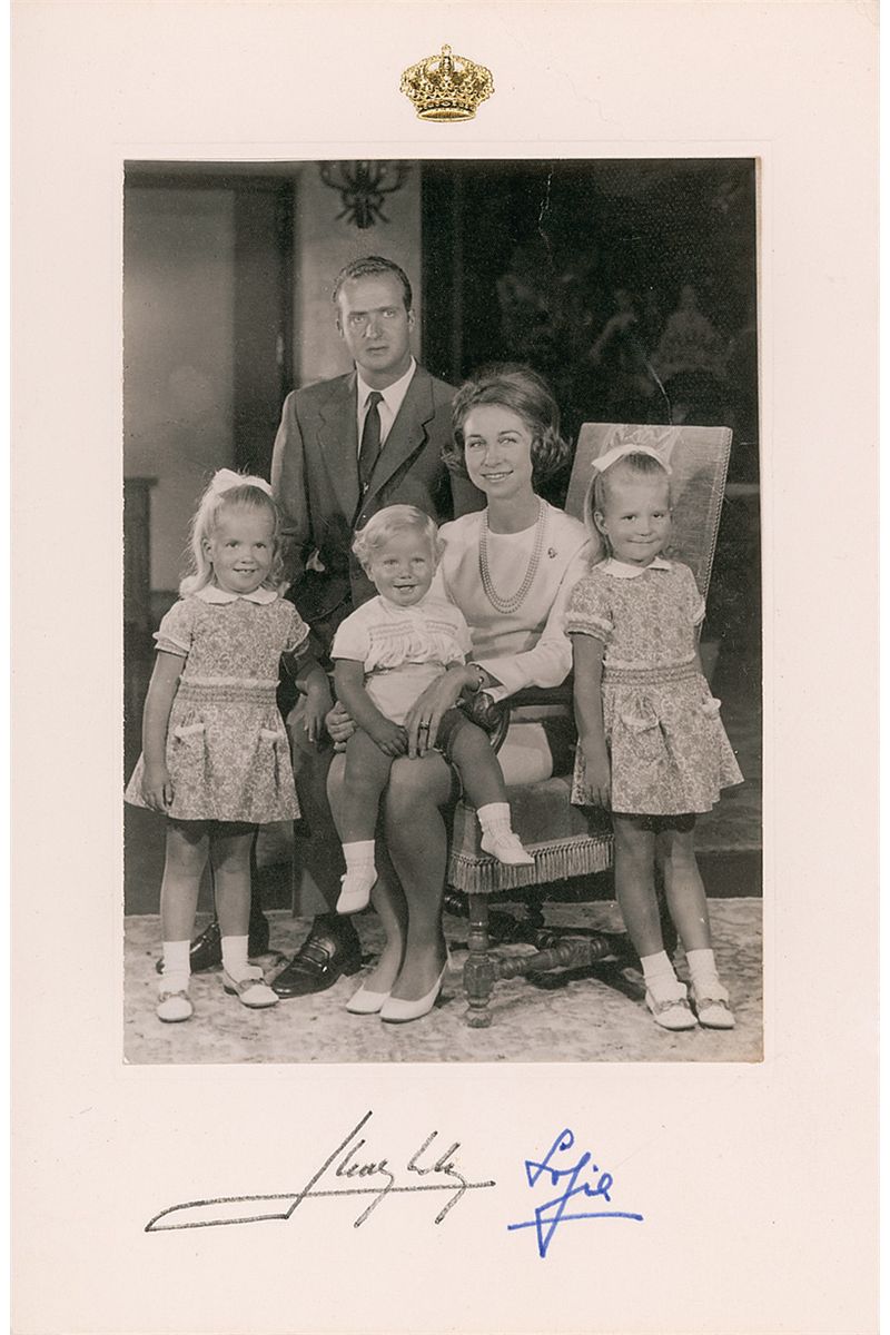 King of Spain (born 1938) who ascended the throne in 1975, two days after the death of Francisco Franco, and oversaw the troubled nation’s transition to a constitutional monarchy. Matte-finish 4 x 6 photo affixed to its original 5.75 x 8.5 mount, signed on the mount in black felt tip by Juan Carlos and in blue felt tip by his wife, Princess Sophia. In fine condition, with a diagonal crease to photo. Accompanied by a matte-finish 4 x 6 portrait of Juan de Borbon, father of Juan Carlos, signed in the lower border and dated 1974.