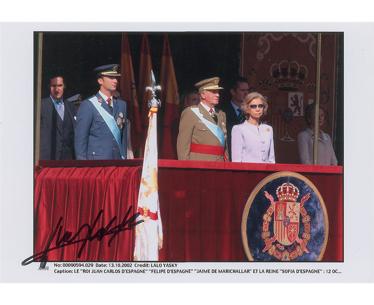 King of Spain (born 1938) who ascended the throne in 1975, two days after the death of Francisco Franco, and oversaw the troubled nation’s transition to a constitutional monarchy. Color glossy 11.75 x 8.25 photo of Juan Carlos standing beside Queen Sophia at a royal ceremony, signed in the lower left in black felt tip. In fine condition, with minor creasing to edges.