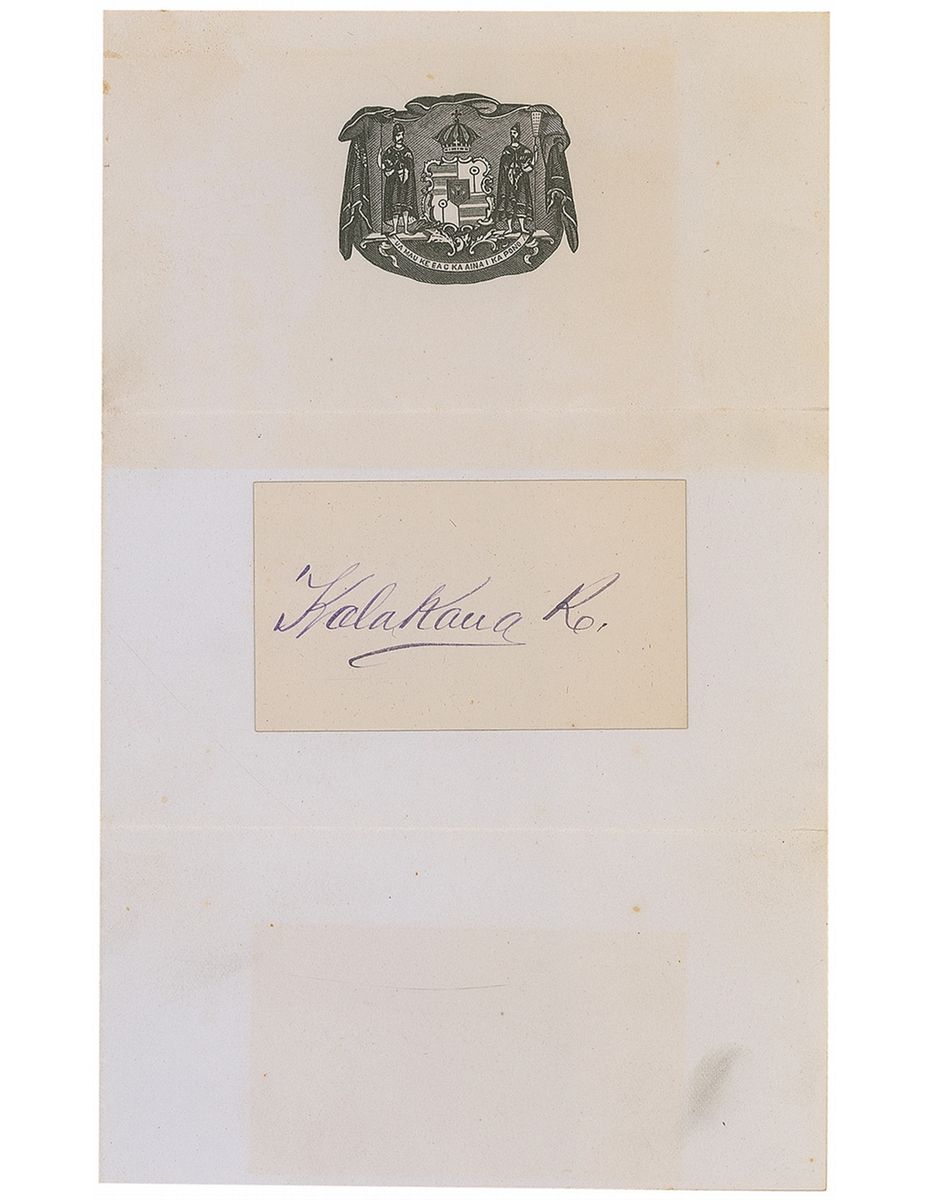 King of Hawaii, 1874–91. In February, 1874 Kalakaua was elected to the vacant throne by a legislature that had been convened for the purpose. Kalakaua almost single-handedly restored many of the nearly extinct cultural traditions of the Hawaiian people. These included myths and legends, and the hula, which had been forbidden by the missionaries for over 70 years. Vintage fountain pen signature, “Kalakaua K,” on an off-white 3 x 1.5 card. Card is affixed to a 5 x 8 sheet of stationery with a collector’s notation on reverse reading “Given to me by the King at the Revere House Boston, Jan 7th, 1875.” In fine condition.