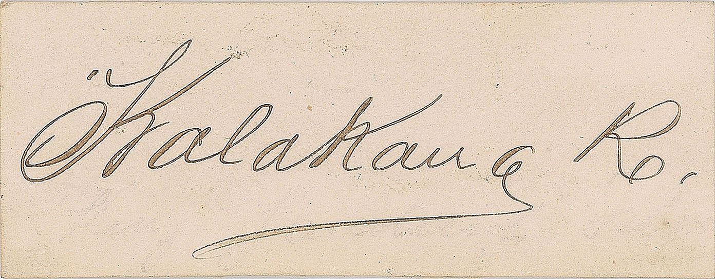 King of Hawaii (1836-1891) who was elected to the vacant throne in 1874 by a legislature that had been convened for the purpose. Kalakaua almost single-handedly restored many of the nearly extinct cultural traditions of the Hawaiian people. Very desirable vintage ink signature, "Kalakaua R.,” on an off-white 2.75 x 1 clipped card. In fine condition.