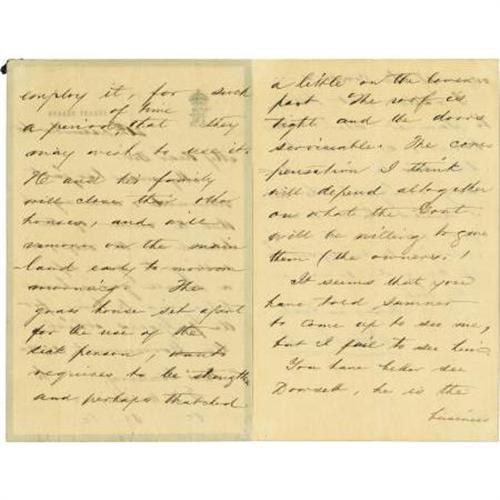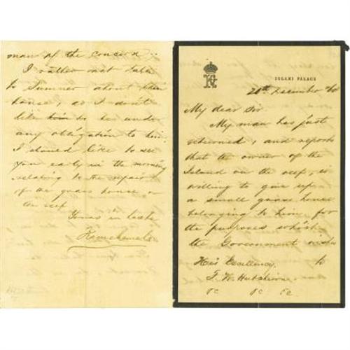 <B>King Kamehameha IV of Hawaii Autograph Letter Signed</B></I> "<I>Kamehameha</B></I>". Four pages, 4.5" x 7" on Iolani Palace stationary, 20th December, "<I>60</B></I>" 1860 , to F. W. Hutcheson, his minister of finance. In part: "<I>My dear sir, my man has just returned, and reports that the owner of the Island on the reef, is willing to give up a small grass house belonging to him, for the purposes which the Government wishes to employ it, for such a period of time, that they may wish to use it...The compensation I think will depend altogether on what the Govt will be willing to give them (the owners.)...You have better see Dowsell, he is the business man of the concern. I rather not talk to Sumner about their house, as I don't like to be under any obligation to him. I should like to see you early in the morning relaxing to the repair of the grass house on the reef. Yours in haste</B></I>". Separations at folds, otherwise near fine condition. <BR><BR><b>Shipping:</b> Flat Material, Small (<a target="_blank" href="http://www.heritageauctions.com/common/shipping.php">view shipping information</a>)