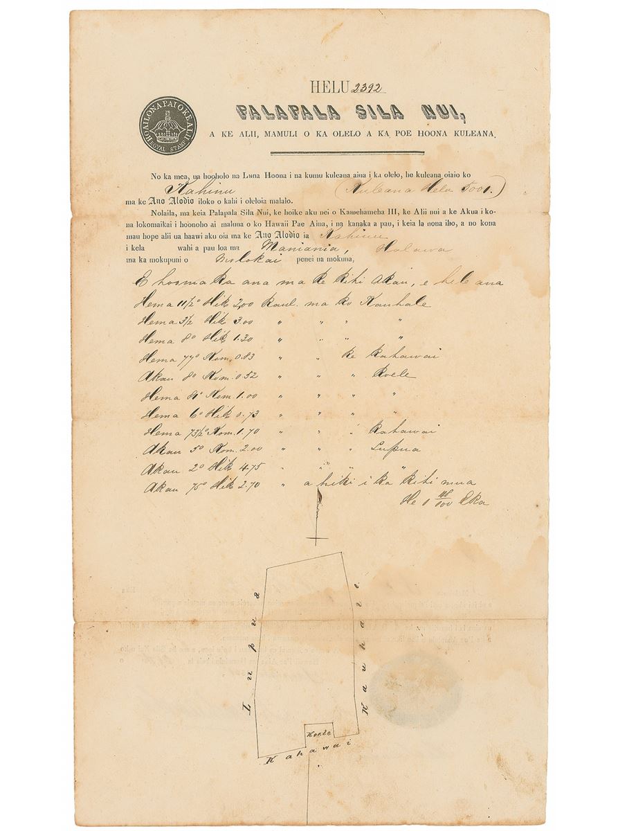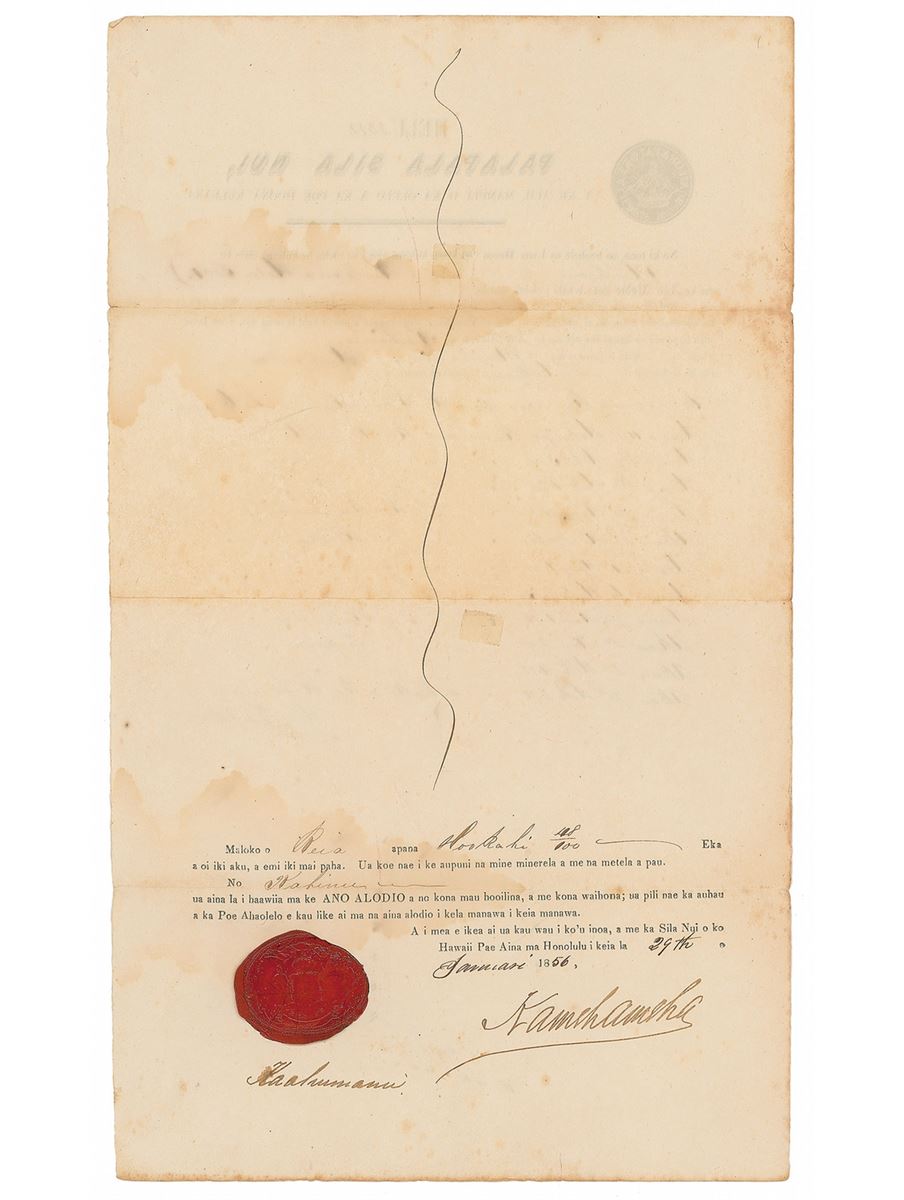 Fourth monarch (1834–1863) of the Kingdom of Hawaii who ruled from 1855 until 1863, when he passed away from chronic asthma at just 29 years old. Partly-printed DS in Hawaiian, signed “Kamehameha,” one page both sides, 8.25 x 14, January 29, 1856. Deed for a parcel of land on the island of Molokai, featuring a sketch of the plot at the bottom. Signed on the reverse in ink by Kamehameha as king and countersigned by his sister Kaahumanu as kuhina nui, a role similar to prime minister. Retains the red wax seal affixed at the conclusion. In very good condition, with large areas of mild dampstaining, scattered soiling, and a small piece of tape affixed to the reverse.