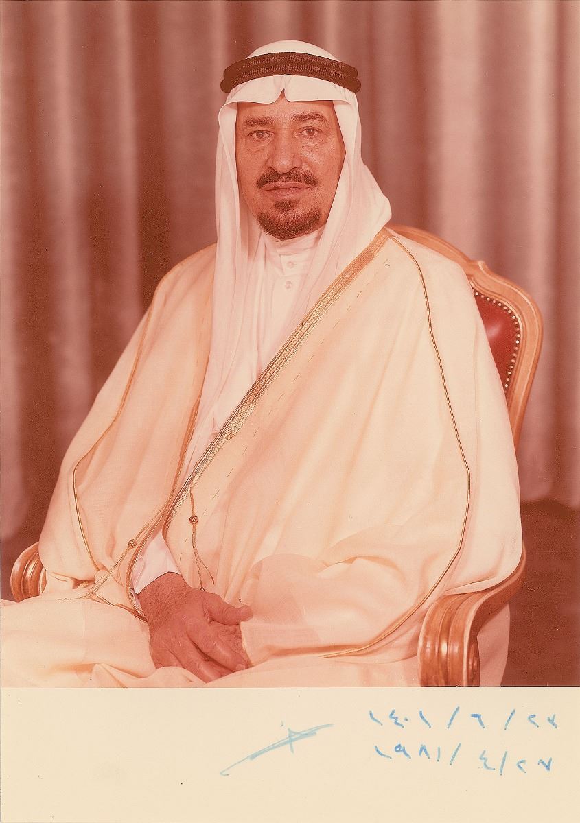 King of Saudi Arabia (1913-1982) who ruled from 1975 until his death. Color semi–glossy 5.75 x 8 formal photo of King Khalid, signed in the lower border in blue felt tip and dated in an unknown hand. Housed in its original presentation folder. In fine condition, with the signature a shade or two light.