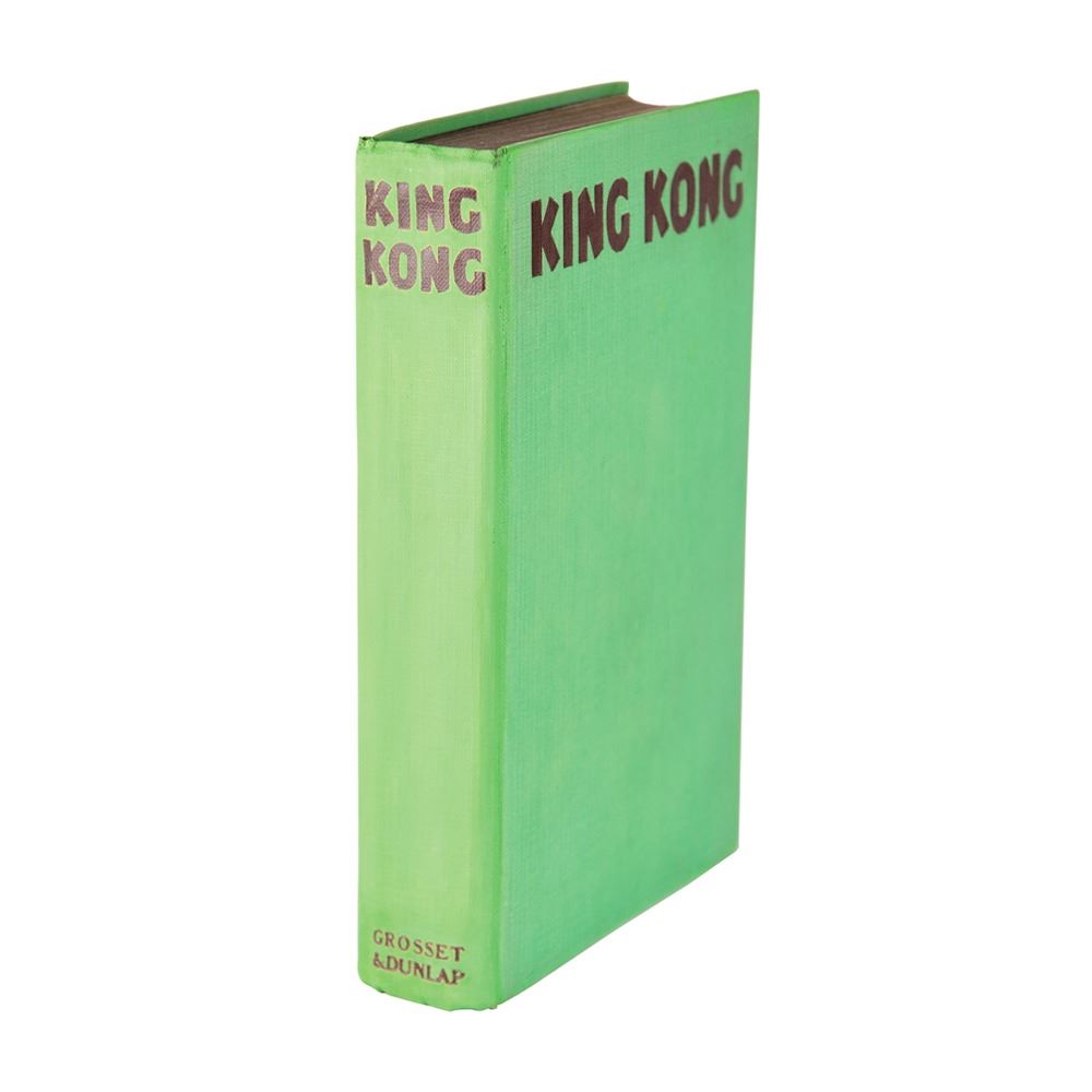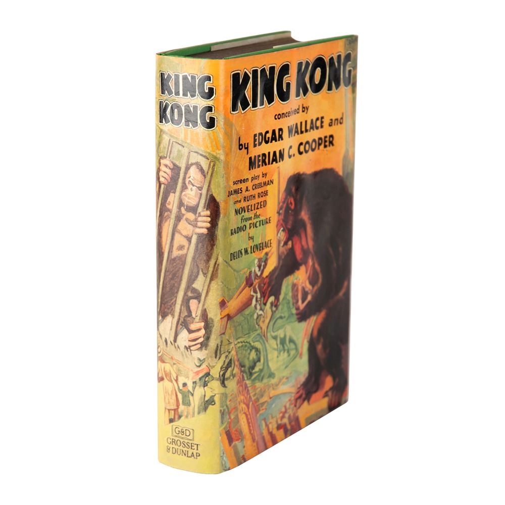 First edition book: King Kong, conceived by Edgar Wallace and Merian C. Cooper, novelized by Delos W. Lovelace. First edition. NY: Grosset & Dunlap, 1932. Hardcover bound in original green cloth lettered in dark maroon, pictorial endpapers showing several action stills from the movie, with scarce first-issue color pictorial dust jacket, 5.75 x 8.25, 249 pages. Book condition: VG+/VG, with dust jacket expertly restored along edges and spine panel slightly faded. Accompanied by a custom-made clamshell box made by Dragonfly Bindery/Studio of Woonsocket, Rhode Island.