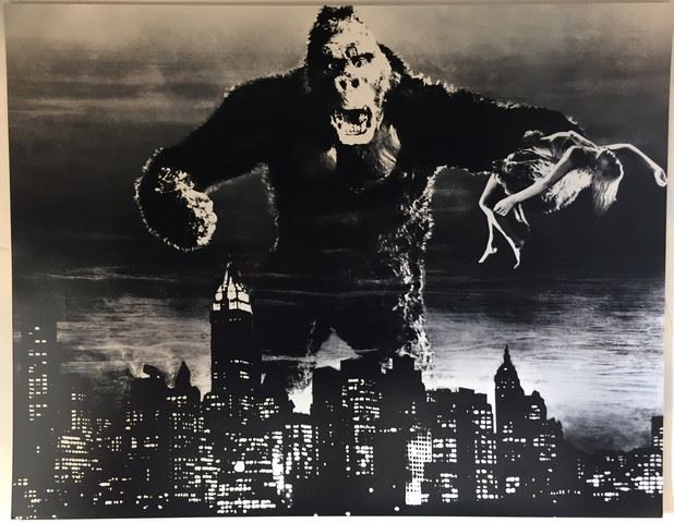 Black and white, iconic photo of the original King Kong movie. The photo shows a giant gorilla, King Kong, standing on the Empire State Building in New York City. He is holding a woman, Fay Wray, in his hand. The photo is iconic because it captures the scale and power of King Kong. It also shows the vulnerability of Fay Wray, who is at the mercy of the giant ape. (11"x14").