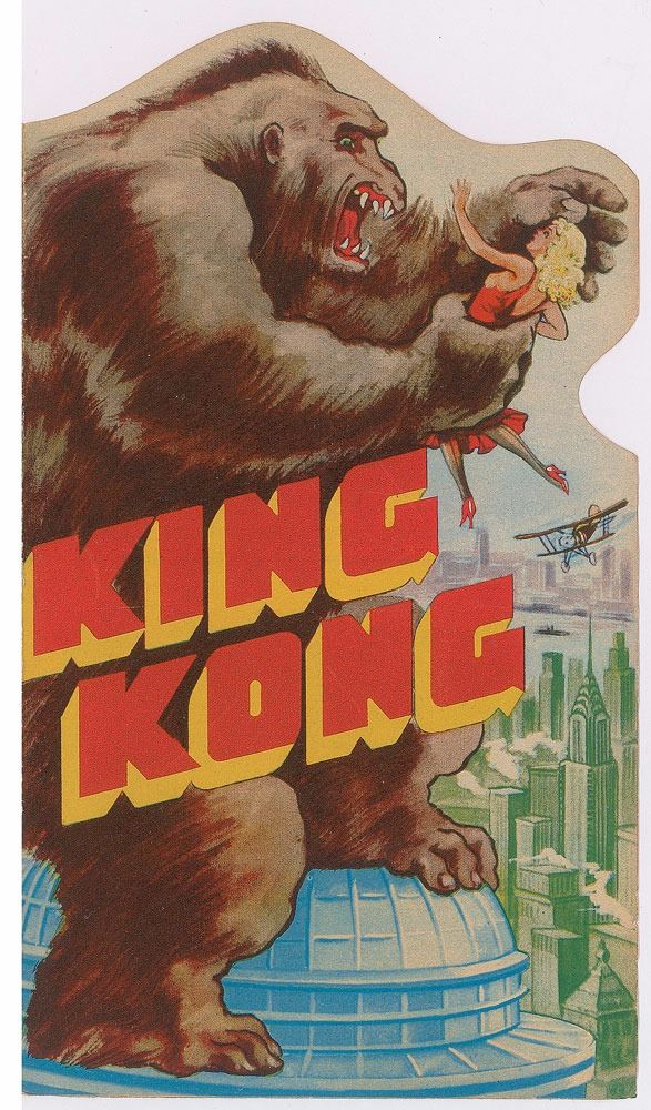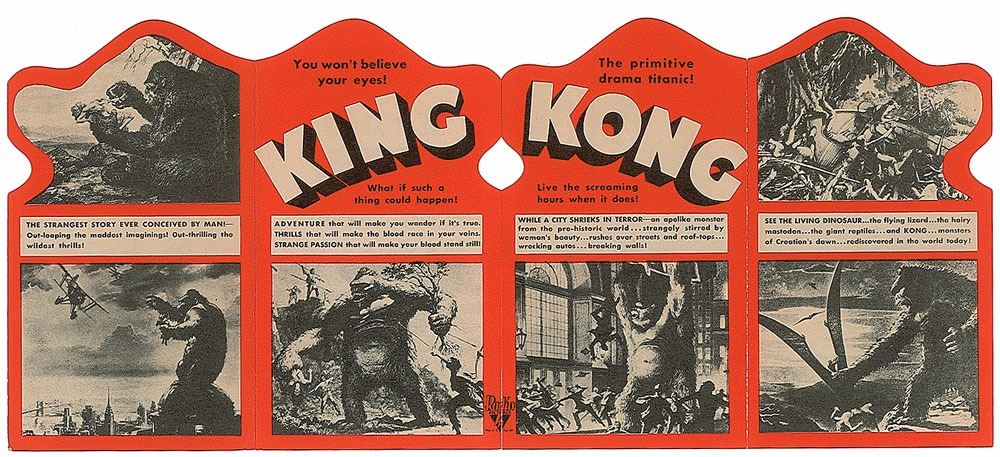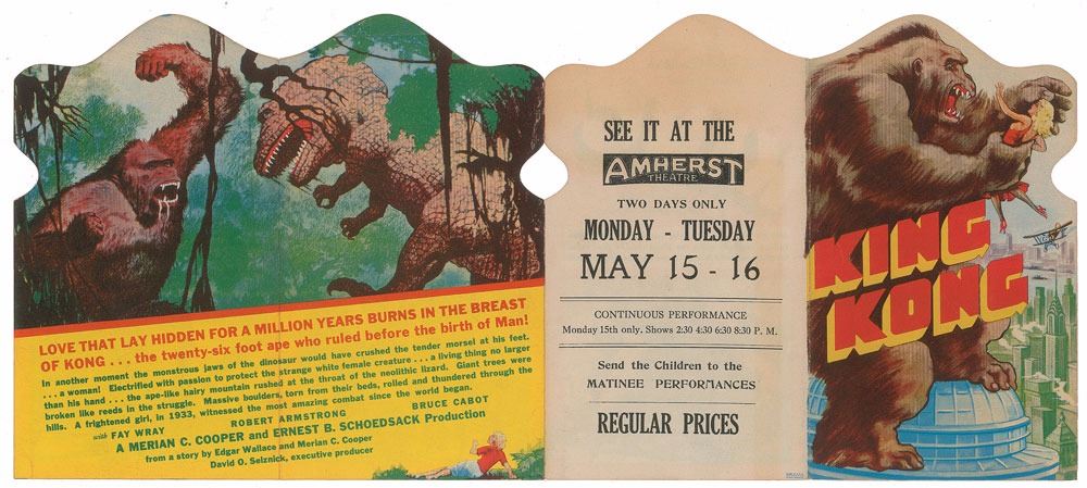 Fantastic original 1933 RKO die-cut promotional herald for King Kong, 4 x 7, which unfolds to a four-panel spread measuring 16 x 7. The interior depicts six dramatic stills from the film, and the reverse features an illustration of King Kong fighting a dinosaur and an advertisement for showings at the Amherst Theatre. In fine condition, with a couple tiny edge separations at folds and a mild block of toning to the theater advertisement panel; the colors of the flyer remain bright and vivid.