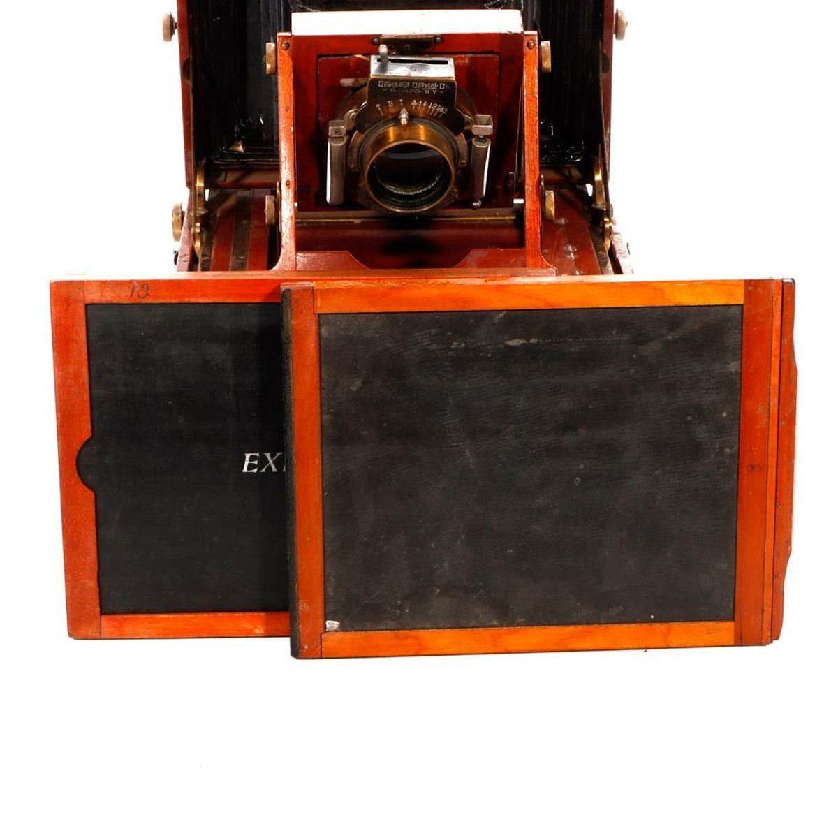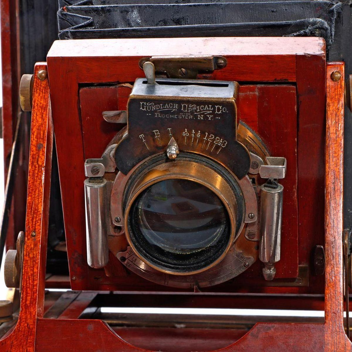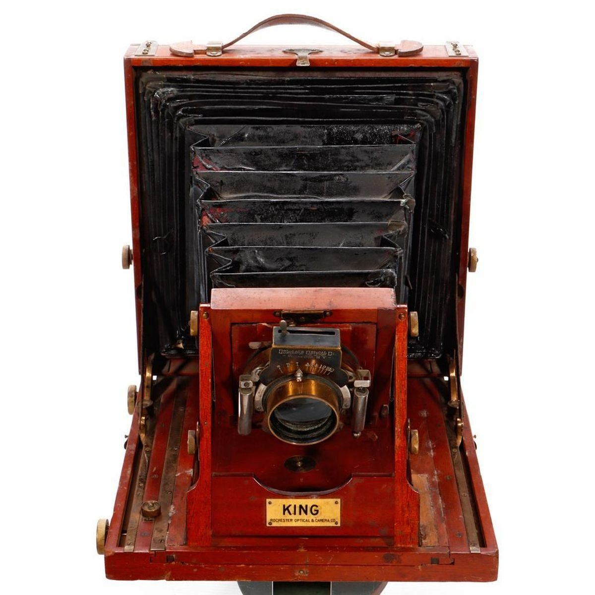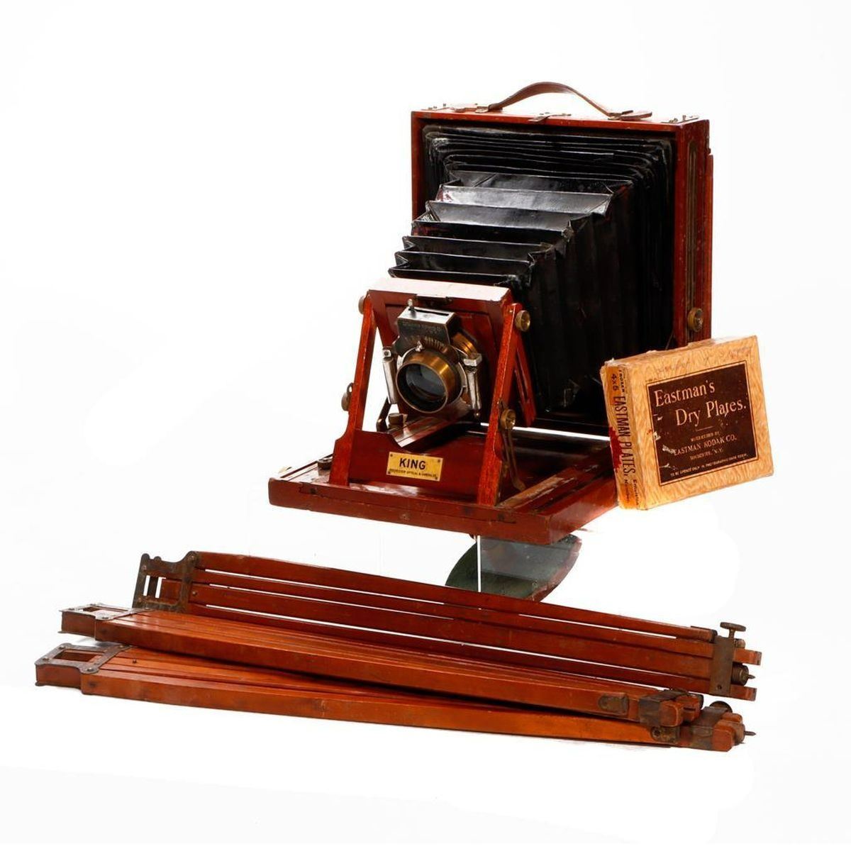 Consists of the camera box with tripod attachment; marked "King / Rochester & Optical Co." Includes the three-piece tripod stand; Gundlach Optical Co. lens/slide-in panel; four plate holders; box of dry plates; mirror; and wide angle lens (panel broken). Condition: The bellows with damage, many of the corners with old repairs; surface scuffing to wood; untested.