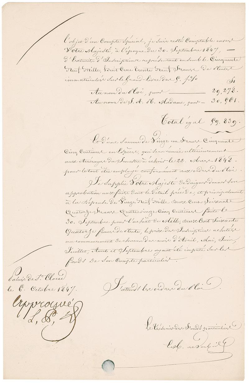King of the French from 1830 to 1848 Manuscript DS, in French, signed “Approved L. P.,” one page, 8 x 12.5, October 6, 1847. Untranslated financial document, signed by the king in the lower left corner. A couple small tears to bottom edge, trivial ink spot to bottom, and some light edge wear, otherwise fine condition.