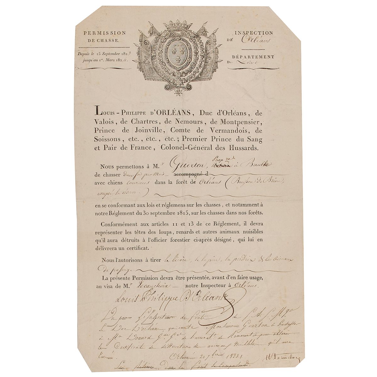 King of the French from 1830 to 1848 . Partly-printed DS, in French, signed “Louis Philippe d'Orléans,” one page, 9 x 15, September 20, 1823. Document granting permission to Monsieur Guecton to hunt wolves, foxes and other such harmful animals, providing he complies with certain regulations including showing their heads to the forester to obtain a certificate. In very good condition, with scattered light toning and soiling, scattered wrinkling and some light edge wear. R&R COA.