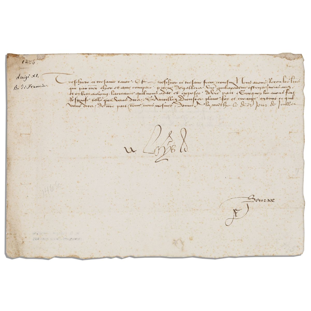 King Louis XI document signed ''Louis'' as King of France. Dating to the mid-1400's, document contains five lines of text handwritten in Old French. Accompanied by an engraved portrait of the king by J. Wilkes of London. Single-page document measures approximately 8.75'' x 6''. Foxing, toning, staining, mounting remnants along the top edge and pencil notations, with further pencil notations and stamp to verso. Overall very good.