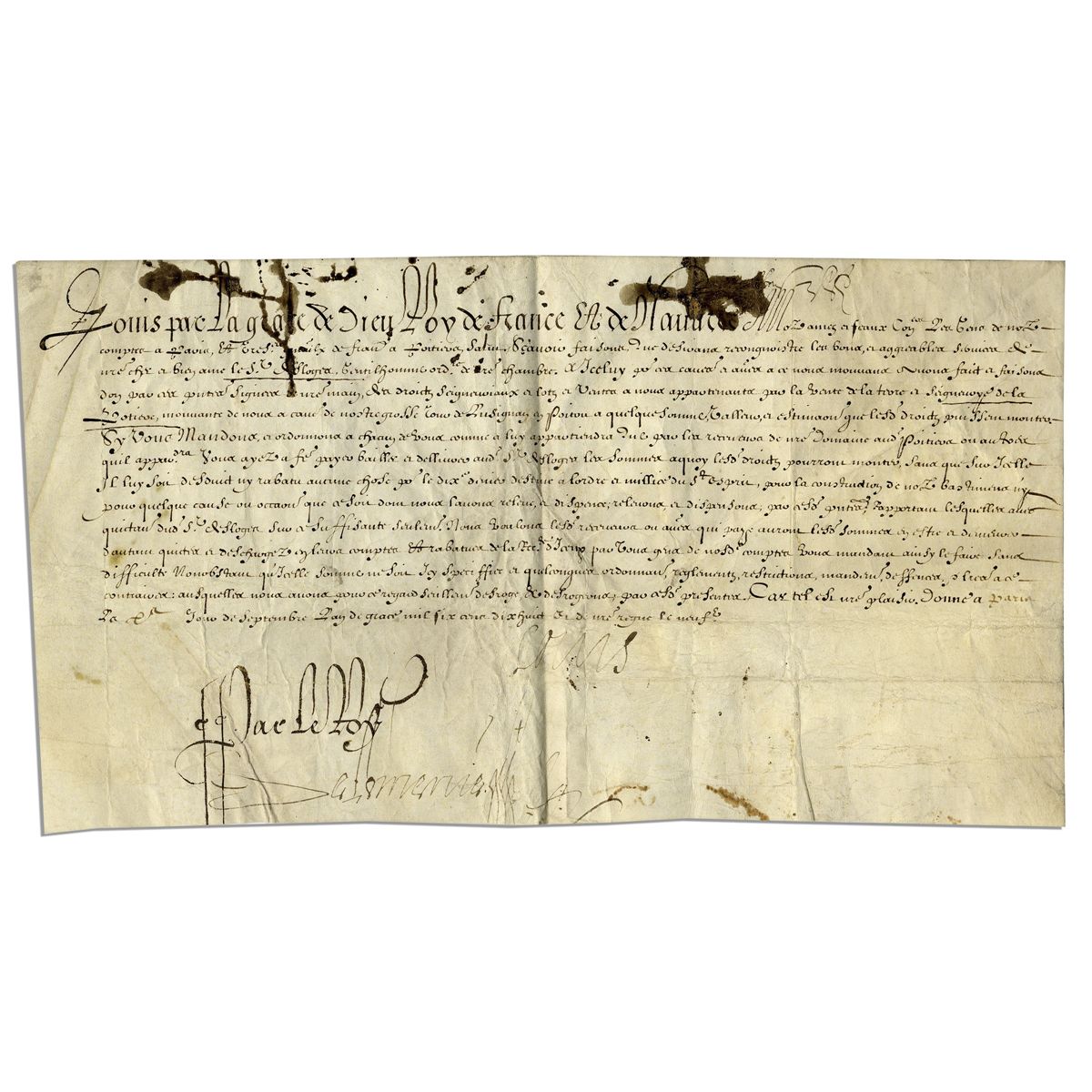 King Louis XIII document signed, dated 10 September 1618. Document is a warrant signed by Louis XIII soon after his marriage to Anne of Austria. Warrant grants seigniorial rights to the Sieur Desloges and is translated from French, ''Louis, By the grace of God King of France and of Navarre, to Our well beloved and faithful Counsellors, the officers of our accounts at Paris, and treasurers General of France at Poitiers, Greeting. We cause you to know, that desiring to recognise the good and agreeable services of our dear and well beloved Sieur Desloges, Gentleman in Ordinary of our Chamber, for these reasons and others moving us to this, we have made, and do make, a gift to him by these presents, signed with our hand, of the seigniorial rights and feudal dues which belong to us because of the sale of the land and lordship of La Potiere, moving from us by reason of our great Tower of Lusignan in Poitou, at whatever sum, value and estimation that the said rights may amount to. Also we command and order you, to each of you as it concerns him, that you cause the receivers of our domain at Poitiers aforesaid, or on the lands to which it will appertain, to pay, render and deliver to the said Sieur Desloges the sums to which the said rights can amount, without there being deducted or discounted there from anything for the ''tenth penny'' intended for the order and militia of the Holy Spirit, for the construction of our buildings, or for anything or occasion whatever of which we know relief and dispensation, and we relieve and dispense by these said presents; reporting the same as a quittance of the said Sieur Desloges hereupon, which is sufficient by this alone. Our will is that the said receivers, or others who pay, shall have the said sums on being and remaining to that extent quitted and discharged in their accounts, commanding you also to do it without raising impediments, notwithstanding that the sum is not here specified and despite any ordinances, regulations, restrictions, commands, prohibitions and letters contrary hereto: from which we have, in this regard only, derogated, and to derogate, by these said presents, For such is our pleasure. Given at Paris, the tenth day of September, in the reign of grace one thousand six hundred and eighteen, and the ninth of our reign.'' Signed ''Louis'' boldly at close of document. Measures 14.75'' x 8'' with some ink blotting to top and creasing throughout. Very good overall.