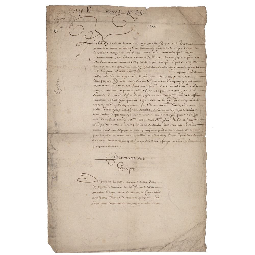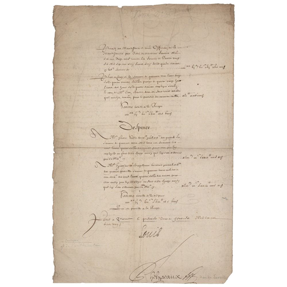 Manuscript DS, in French, signed ‰ÛÏLouis,‰Û one page both sides, 9 x 14, 1621. Document issued at Lyon, evidently concerning finances. Signed at the conclusion by King Louis XIII. In very good to fine condition, with light soiling, creasing, and an unobtrusive tear touching a few words of text.