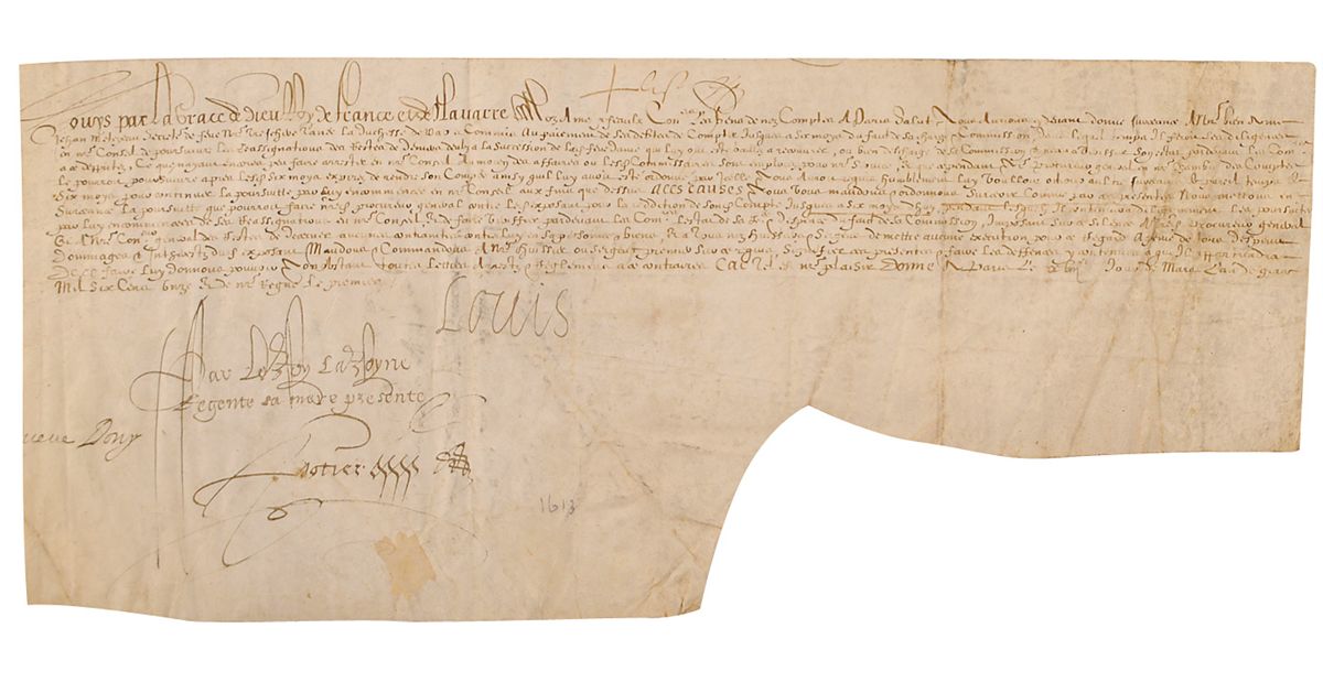 King of France (born 1601) from 1610 until his death in 1643. Manuscript vellum DS, in French, signed “Louis,” one page, 16 x 7, 1613. Untranslated document neatly signed at the conclusion by the King. Several vertical folds, one through a single letter of signature, scattered creases and wrinkles, right portion of bottom edge trimmed, some light soiling and toning, and a small pencil notation to bottom, otherwise very good condition.