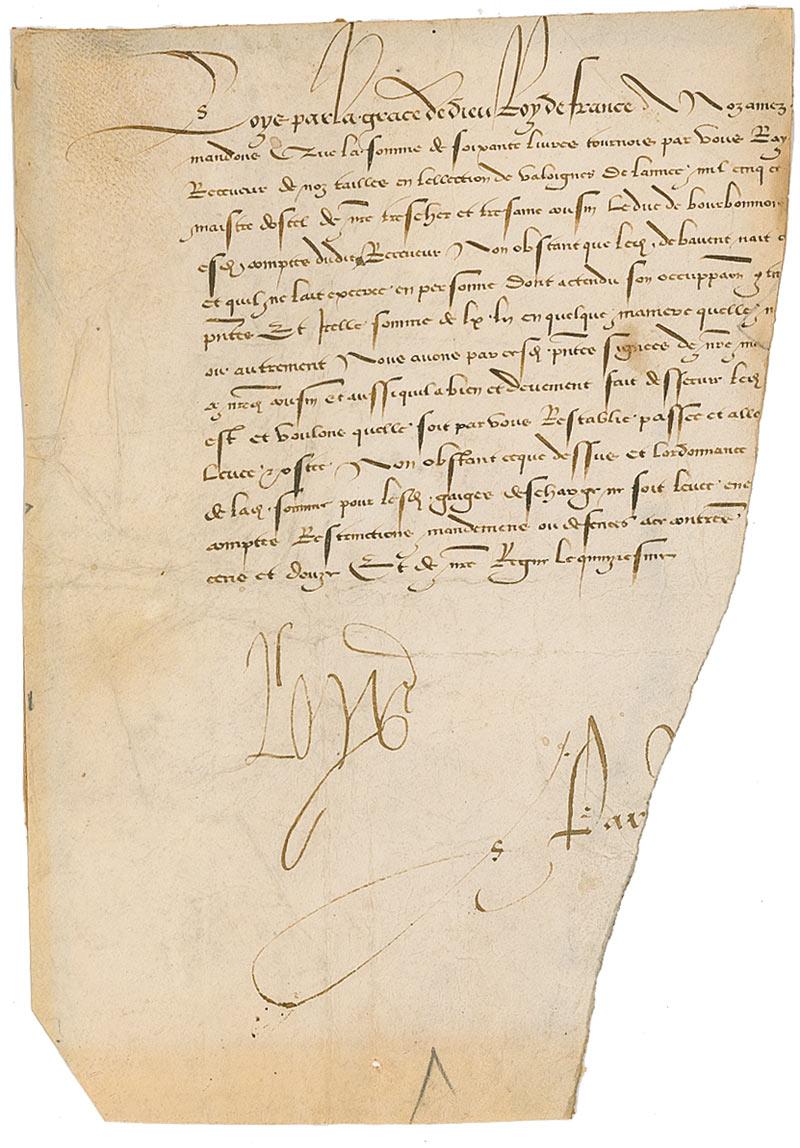 King of France called ‘the Father of the People’ (1462–1515). Untranslated partial vellum DS, in French, one page, 6 x 8.25, no date. In very good condition, with paper loss along the right side affecting text, intersecting folds, moderate wrinkling, scattered soiling, toning heavier at the edges. and the edges reinforced from the back.