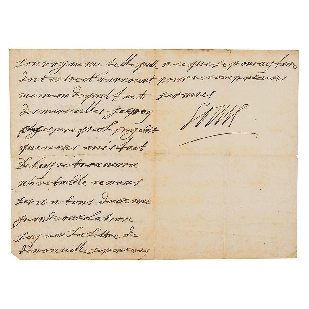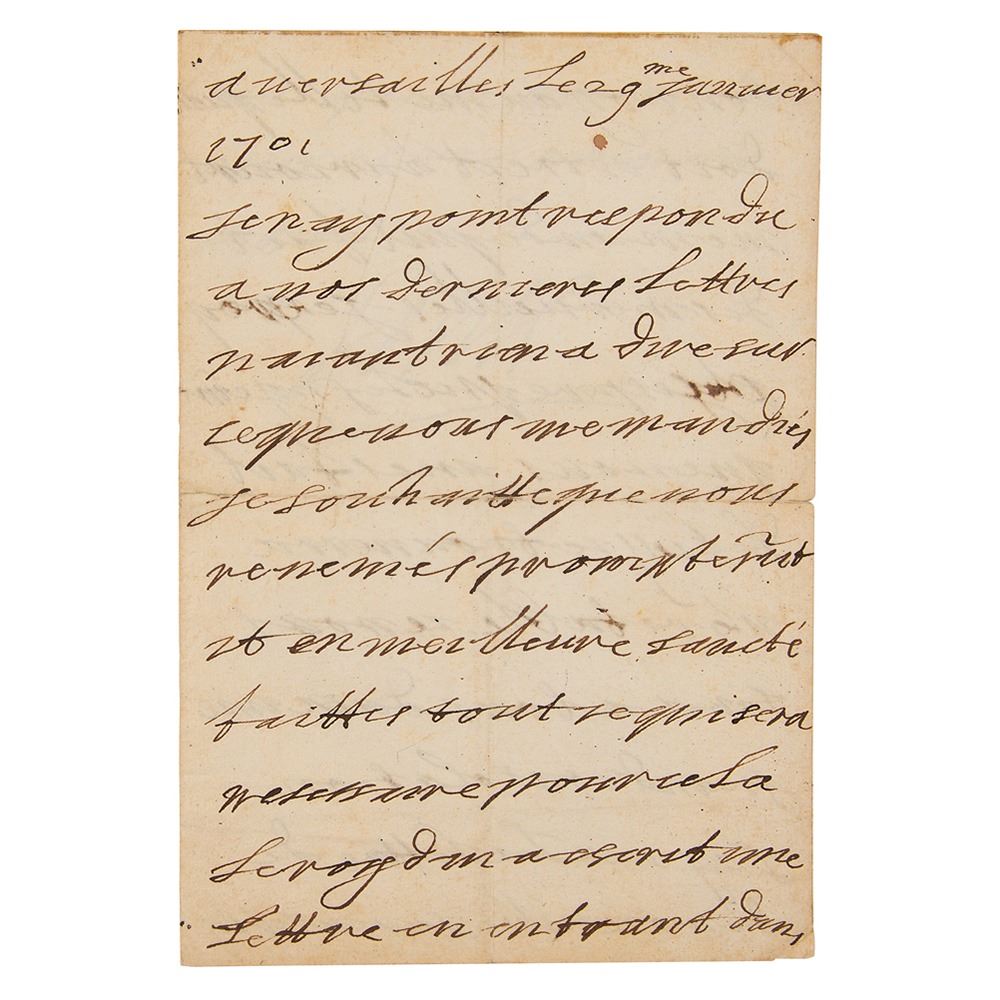 King of France (born 1638) from 1643 until his death in 1715, known as the 'Sun King' for the glittering splendor of his court at Versailles and the unparalleled glory of France during his 72-year reign. Rare ALS in French, signed “Louis,” three pages on two adjoining sheets, 5.25 x 7.75, January 29, 1701. Addressed from Versailles, an untranslated handwritten letter from King Louis XIV. In fine condition.