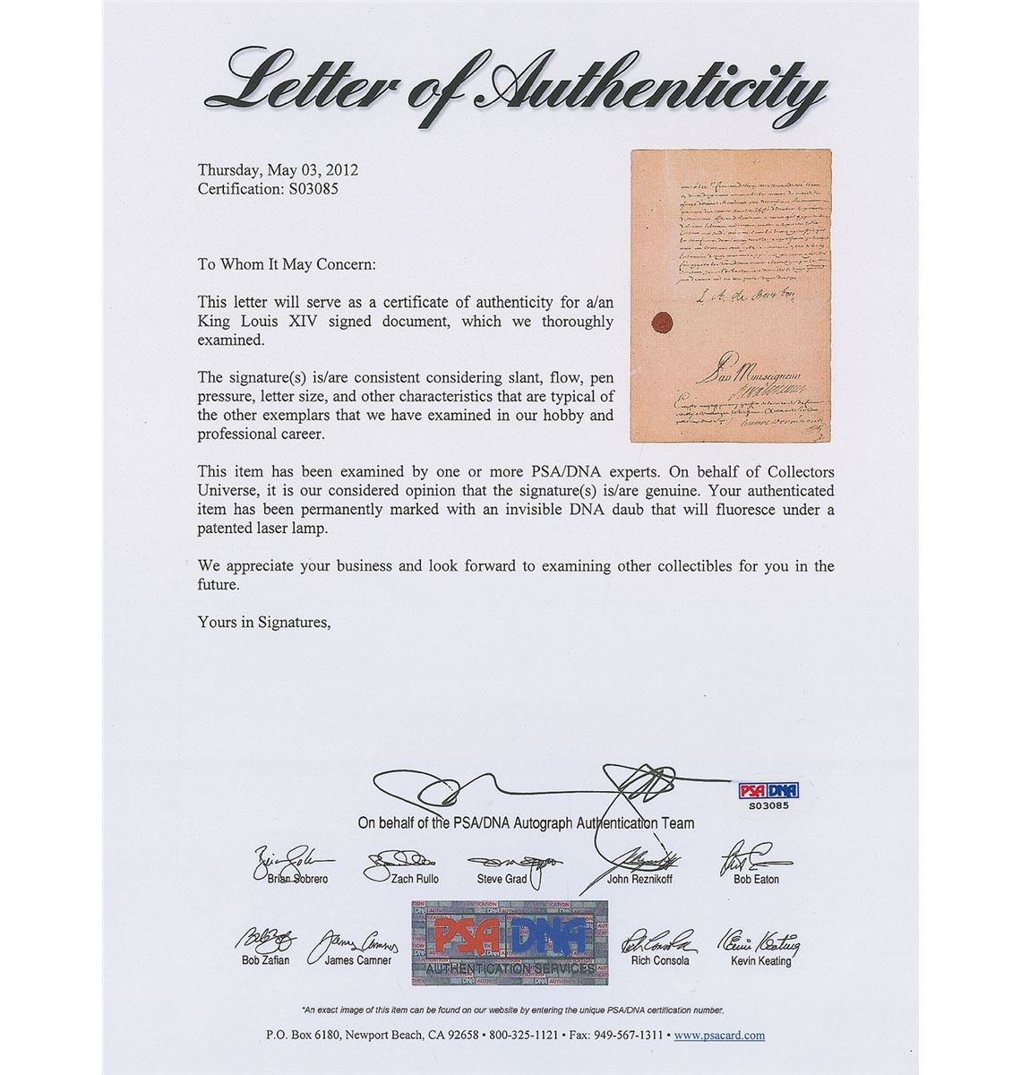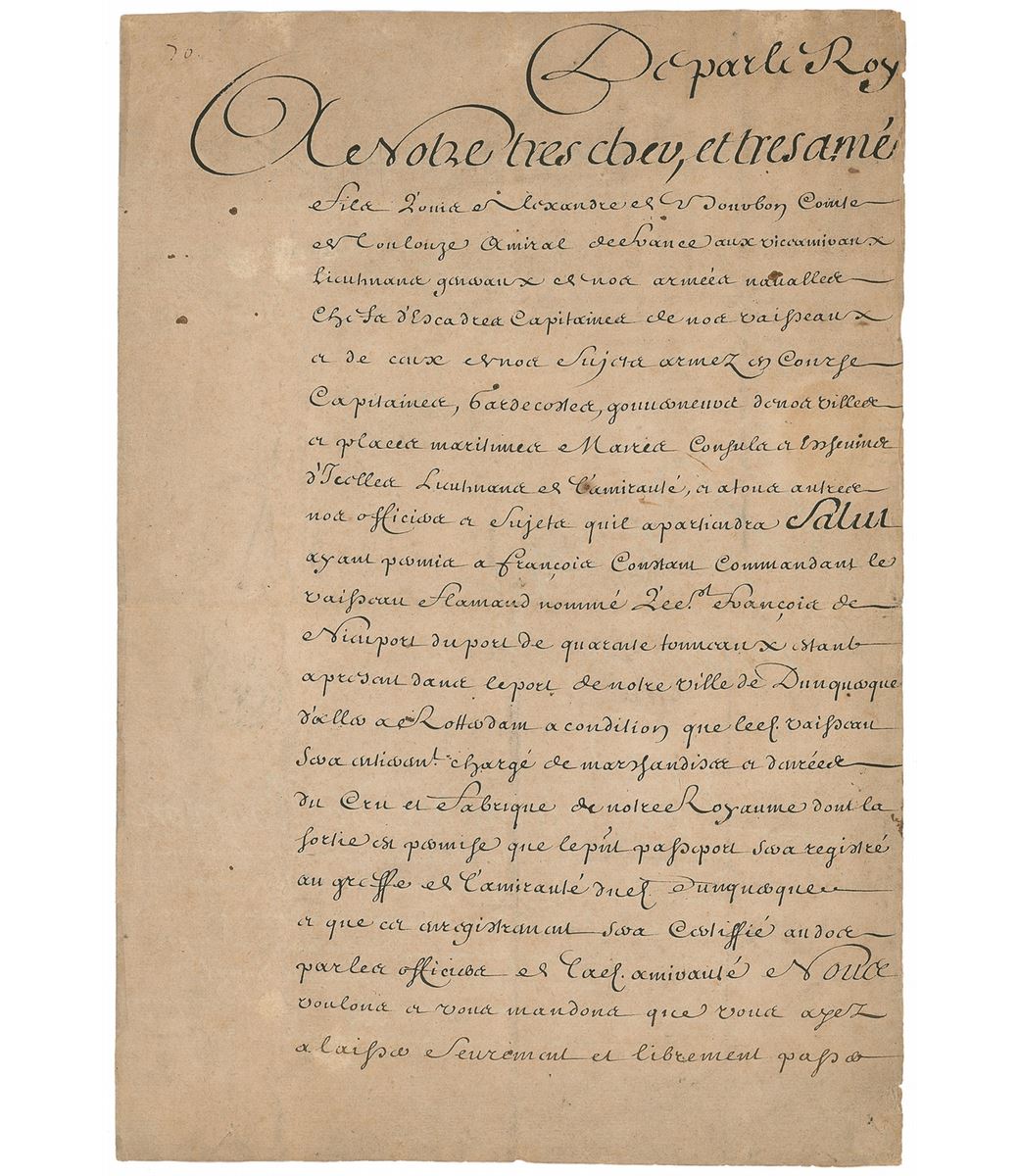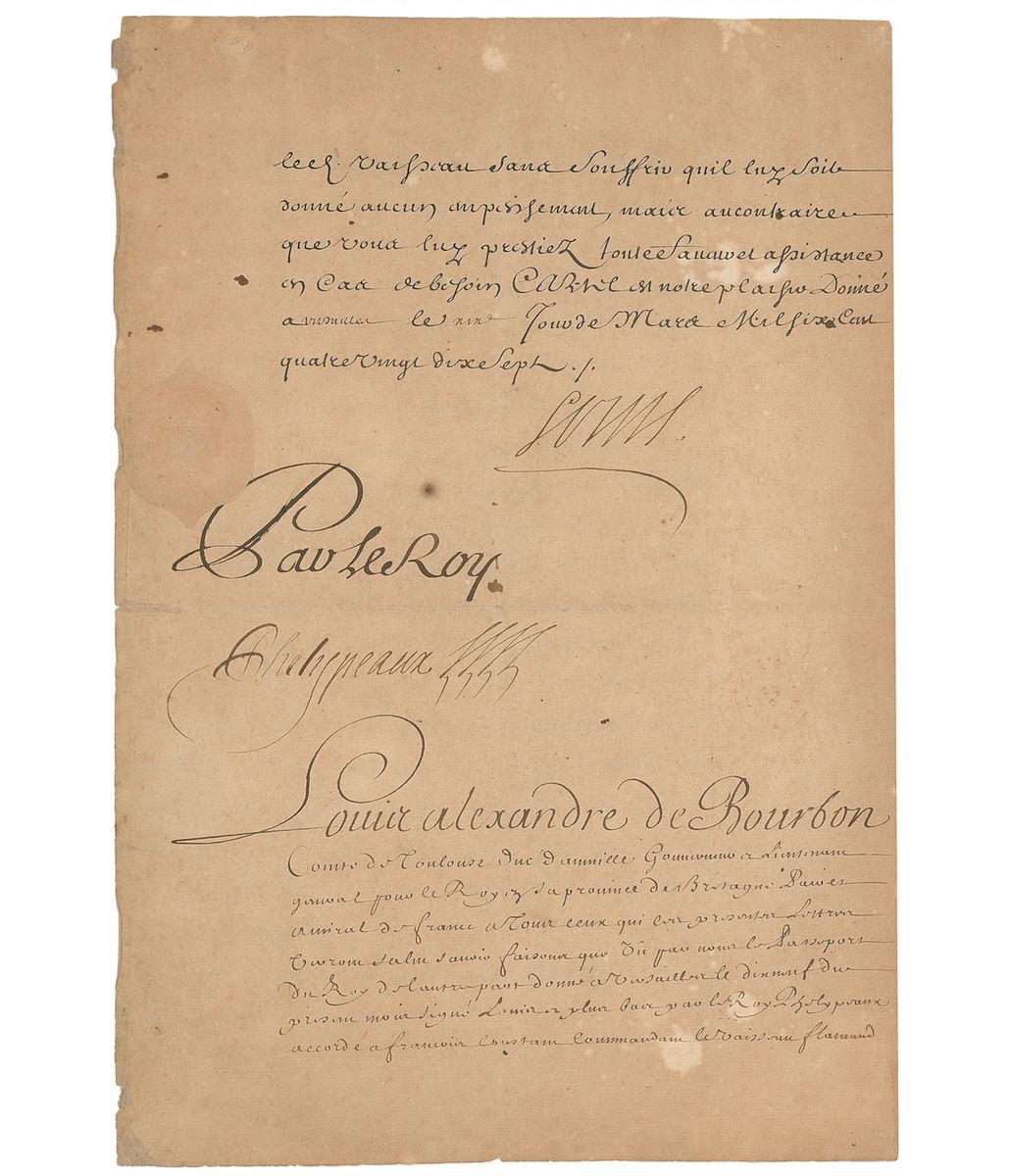 King of France (born 1638) from 1643 until his death in 1715, known as the ‘Sun King’ for the glittering splendor of his court at Versailles and the unparalleled glory of France during his 72-year reign. Manuscript DS in French, signed “Louis,” three pages on two adjoining sheets, 9.5 x 14, March 6, 1697. Ship's papers for Francois Constant Commander of the Flemish vessel "The Sire Francois of Nieuport" granting it safe passage and support, and authorizing it to carry goods and provisions "from our city of Dunkirk to Rotterdam on condition that said vessel's cargo consist of merchandise and provisions that have been grown or manufactured in Our Kingdom.” Signed at the conclusion by King Louis and countersigned by his illegitimate son Louis Alexandre de Bourbon, Minister Phelypeaux, and the Dauphin. The paper seal beside the king’s signature is fully intact, as is the red wax seal on the adjoining page. In very good condition, with professional repairs and restorations, intersecting folds, overall toning, and scattered soiling. Accompanied by a full letter of authenticity from PSA/DNA.