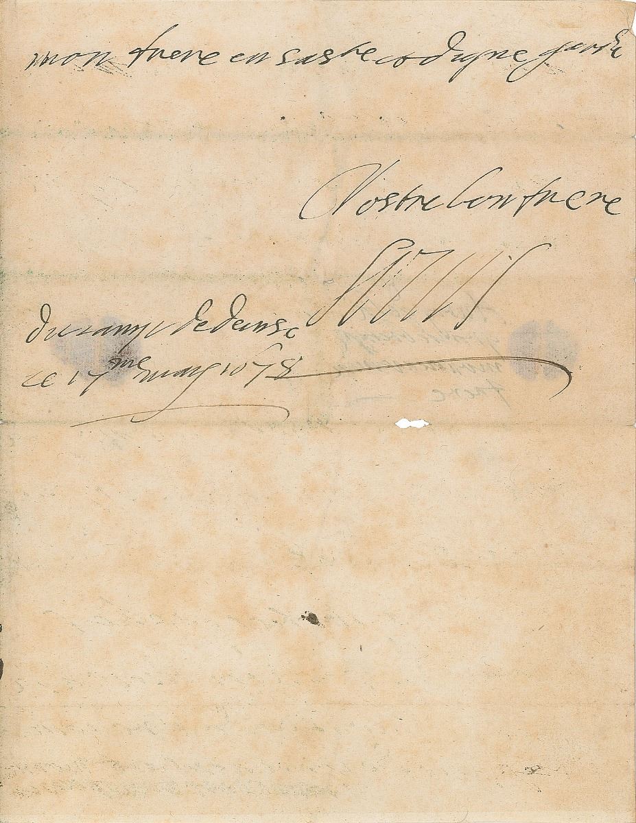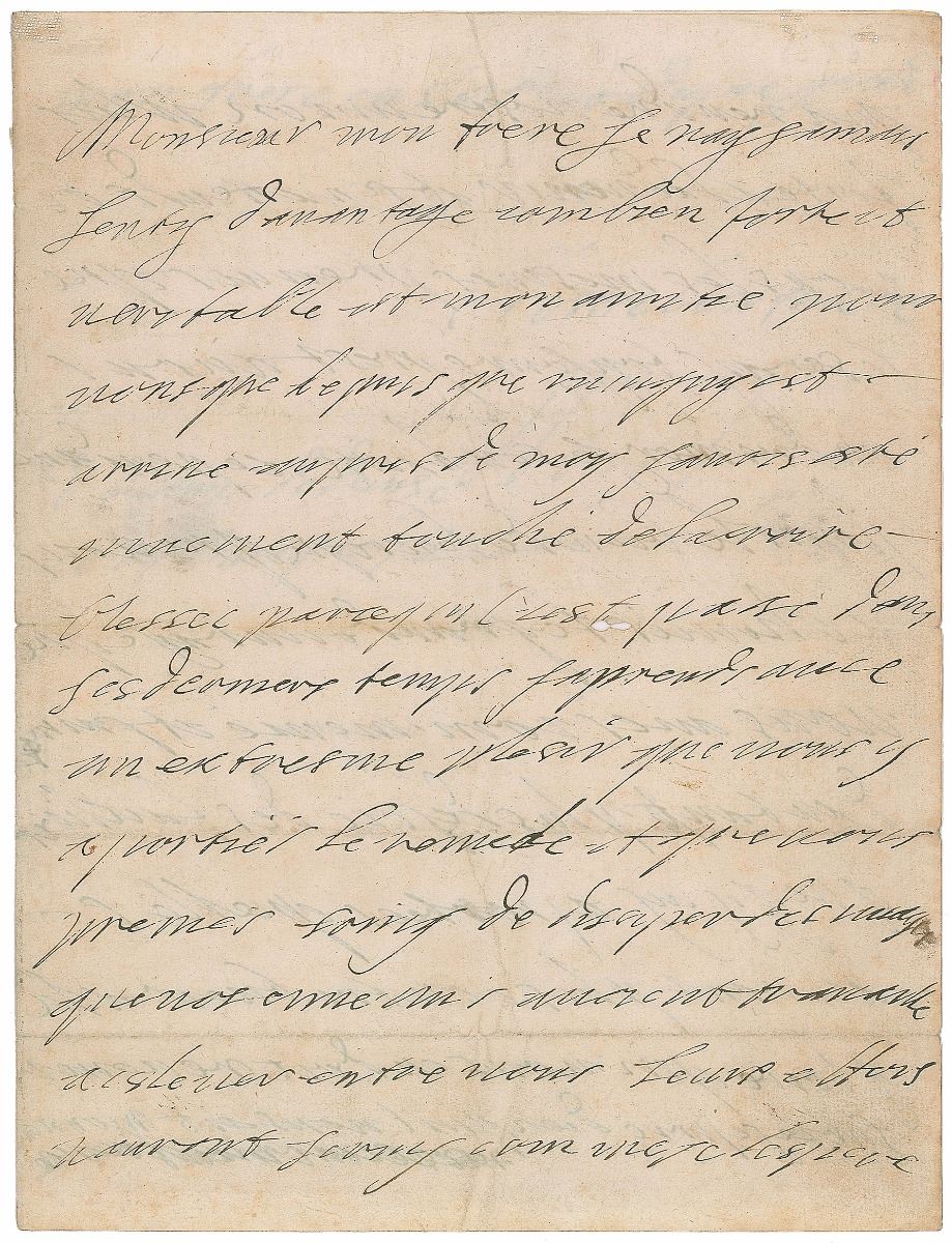 Rare ALS in French, signed “Louis,” three pages on two adjoining sheets, 6.5 x 8.75, May 17, 1678. Letter to King Charles II of Great Britain concerning their relationship, the welfare of their countries, and the repercussions of the war with Holland, in part (translated): “Never before have I ever felt how strong and true my friendship is with you…I learn with pleasure that you are taking pains to dissipate the clouds which our enemies would have labored to raise between us…I wish…for the well-being of Europe, that you may complete the great work you have commenced, and I shall have even more joy from the easy terms I have negotiated as they will have contributed to the glory which must come back to us.” In fine condition, with scattered overall soiling, and a tiny bit of paper loss beneath the signature area. When King Charles II signed his name to the secret Treaty of Dover on June 1, 1670, he affirmed an alliance with King Louis XIV to support the latter in his conquest over the Dutch Republic, a pact which subsequently ignited the Franco-Dutch War of 1672. Written a few months before the Treaties of Nijmegen, a series of accords that established peace between France and the Dutch Republic, this is a warm and insightful letter between two powerful rulers.