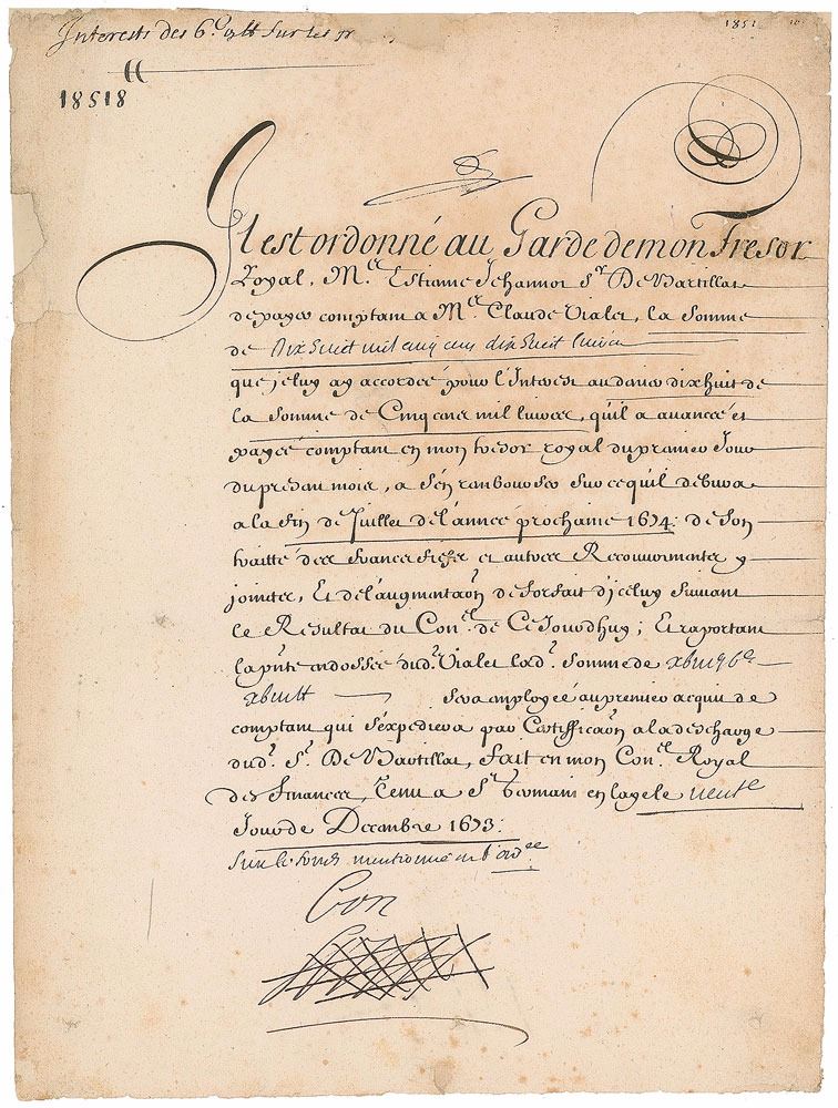 King of France (born 1638) from 1643 until his death in 1715, known as the 'Sun King' for the glittering splendor of his court at Versailles and the unparalleled glory of France during his 72-year reign. Manuscript DS in French, signed “Louis,” one page, 9.5 x 12.75, December 1673. Untranslated order to the treasurer, signed at the conclusion by King Louis; his signature is struck through several times with crosshatch marks. In very good condition, with a small tear to the first line, a repair to the left edge, and some scattered light foxing. Louis signed this to certify that the order had been seen and approved by the king, and his signature was crossed out after it had been paid.