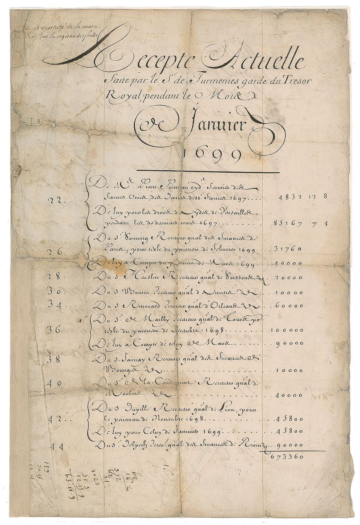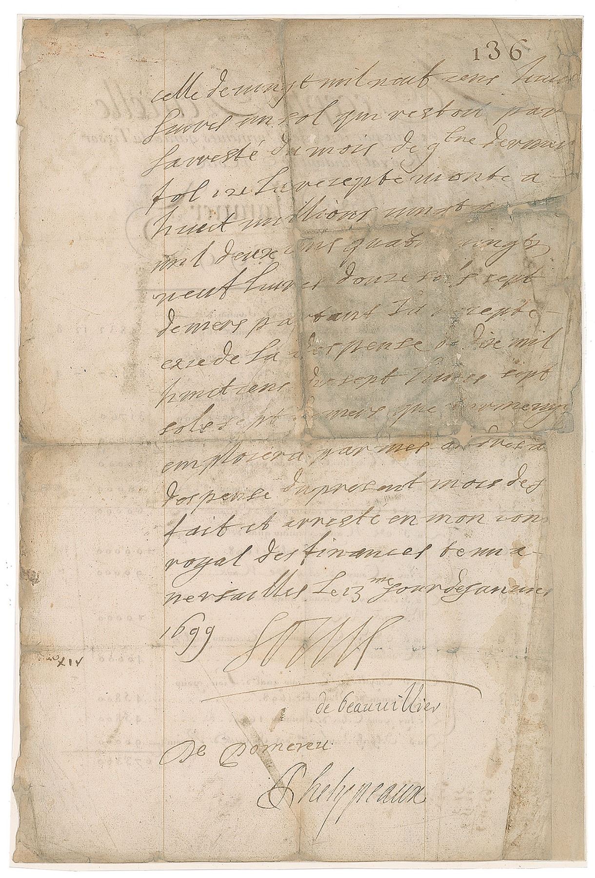 King of France (born 1638) from 1643 until his death in 1715, known as the 'Sun King' for the glittering splendor of his court at Versailles and the unparalleled glory of France during his 72-year reign. ALS in French, signed “Louis,” one page, 9.75 x 14.75, January 23, 1699. On the reverse of a financial document headed "Actual Receipts made by the Sr. of Turmenies, guard of the Royal Treasury, during the Month of January 1699," King Louis XIV pens seventeen lines on finances. The king writes, in part (translated): "That of twenty thousand nine hundred and fifty-two pounds has raised a floor which has fallen by the rest of the last nine months…The receipts amounted to twenty million four thousand two hundred and seventy nine livres twelve sols seven deniers leaving the receipts exceeding the expenditure of ten thousand cents, ten cents seven seven sols seven deniers that Turmenyes will use by my orders for this coming month...Done and arrested in my honor at Versailles, the 23rd day of January, 1699." Signed at the conclusion by King Louis XIV and countersigned by Comptroller General of Finances Louis Phelypeaux; Chairman of the Royal Council of Finances Paul de Saint-Aignan, Duke of Beauvillier; and Auguste-Robert de Pomereu, adviser to the Royal Council of Finances. The front of the document tallies sums amounting to 673,360 pounds. Professionally inlaid within a thin border. In very good condition, with toning, soiling, light stains, and professional repairs to paper loss along the edges and fold intersections. Financial documents from Louis XIV are very rare, as most were lost or destroyed during the French Revolution—most of those known extant are held by the Archives Nationales in Paris.