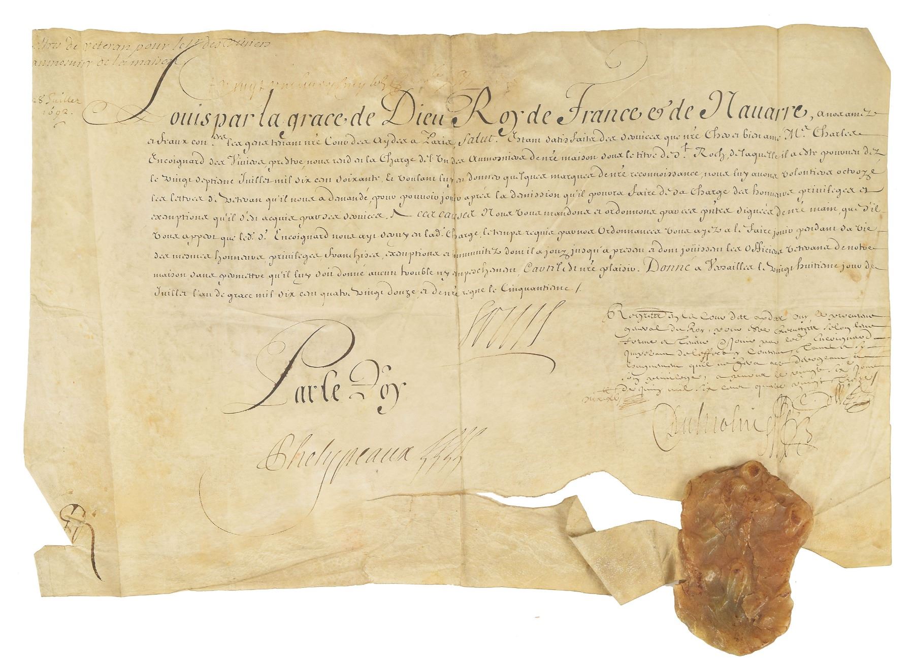 King of France (born 1638) from 1643 until his death in 1715, known as the 'Sun King' for the glittering splendor of his court at Versailles and the unparalleled glory of France during his 72-year reign. Vellum DS in French, signed “Louis,” one page, 18 x 11, July 28, 1692. Untranslated document prominently signed in the center by King Louis XIV, and countersigned by Secretary of State Louis Phelypeaux. The lower portion retains much of its rare large wax seal. In very good to fine condition, with folds and creases, and a failed repair on the reverse of the torn strip that houses the heavy wax seal.