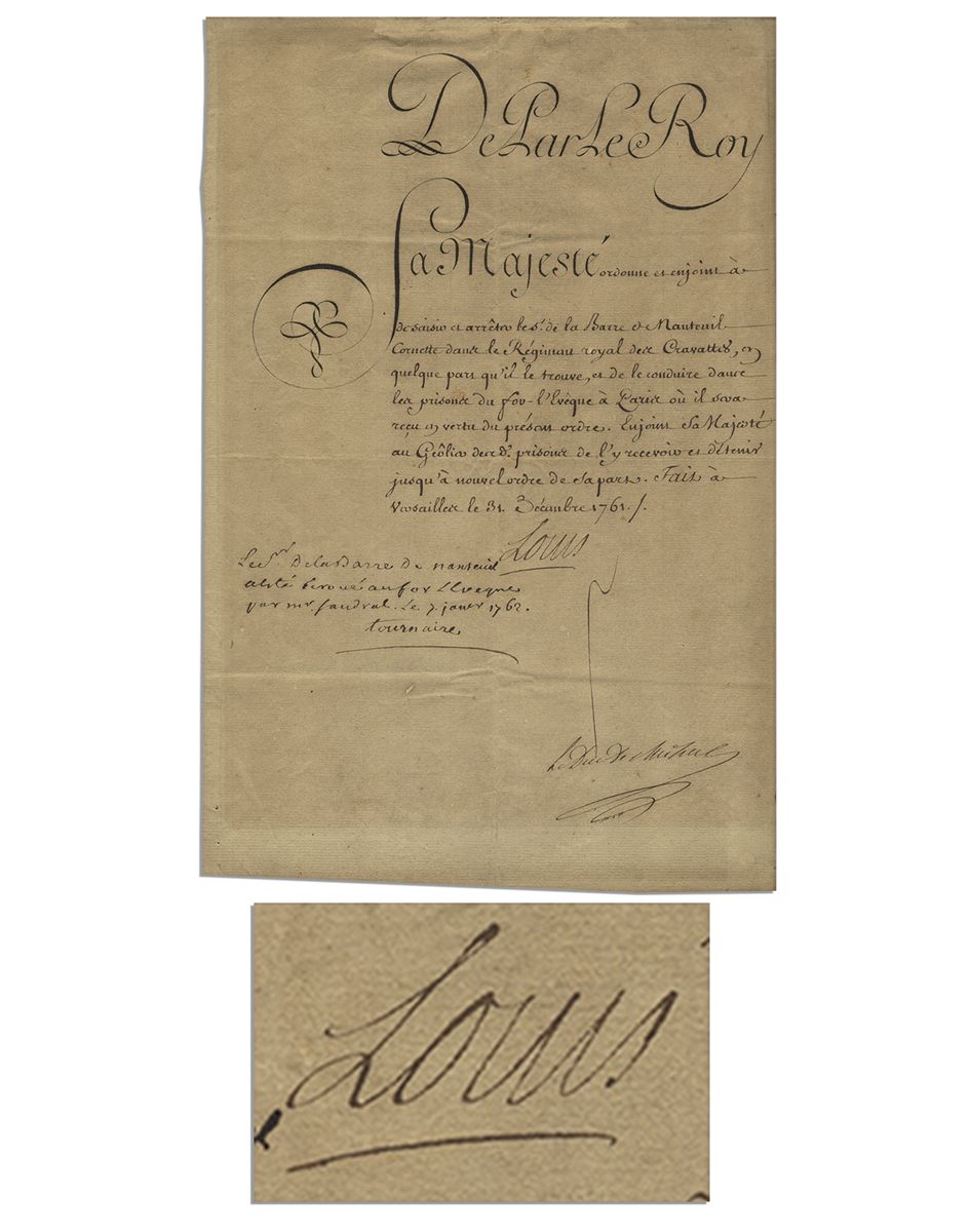 King Louis XV document signed ''Louis'' as King of France and Navarre. French language document is dated 31 December 1761. Measures 8.5'' x 12.5''. Mounted by its top edge to red paper. Uniform toning and an irregularly trimmed bottom edge, otherwise near fine.