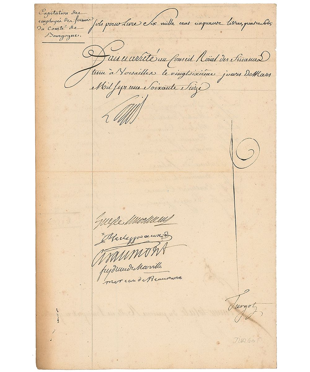 King of France (born 1754) from 1774 to 1792. In the wake of increasing unrest that developed into full-fledged revolution, Louis and his queen, Marie Antoinette, were executed in 1793. Scarce manuscript DS, signed “Louis,” one page both sides, 8 x 12.5, 1776. Significant financial document, signed at the conclusion by the king. Also signed by his important minister Turgot, who famously tried to improve France’s catastrophic financial situation; additionally countersigned by Miromesnil and three other officials, which was required only for documents relating to the most important public expenses. In fine condition, with some light toning to edges.