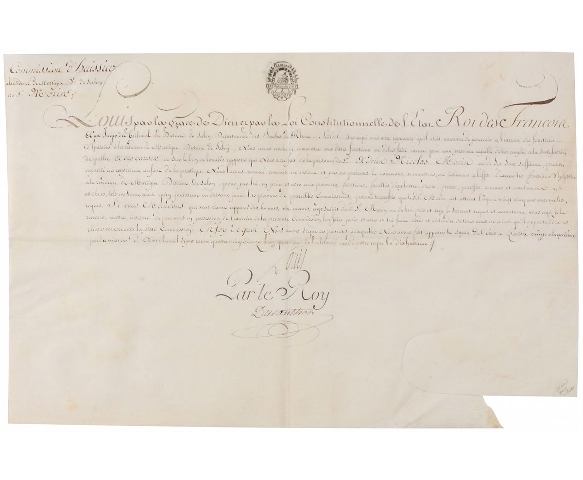 King of France (born 1754) from 1774 to 1792. In the wake of increasing unrest that developed into full-fledged revolution, Louis and his queen, Marie Antoinette, were executed in 1793. Scarce manuscript DS, signed “Louis,” one page, 18.75 x 12.5, April 25, 1792. Crisply penned untranslated judicial appointment neatly signed at the conclusion in black ink by the king and countersigned by the Minister of Justice Antoine Duranthon. In very good to fine condition, with central horizontal and vertical folds, paper loss and a repaired separation to lower right, and a bit of mild toning. This particular document is especially interesting as it was signed on April 25, 1792—the day that the first person ever was guillotined. The document is even more eerie when you consider that the other man who signed the document, Minister of Justice Antoine Duranthon, would be guillotined on December 20, 1793. An especially interesting true piece of history.