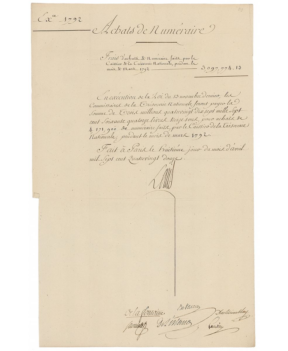 Manuscript DS in French, signed “Louis,” one page, 9.25 x 14.5, March, 1792. Order authorizing the commissioners of the national treasury to make a currency exchange of 3,097,774 pounds, prominently signed by King Louis and countersigned at the bottom by six other officials. In fine condition, with a trimmed left edge. A desirable document signed during a dramatic point in the French Revolution, just five months before the king’s arrest and deposition.