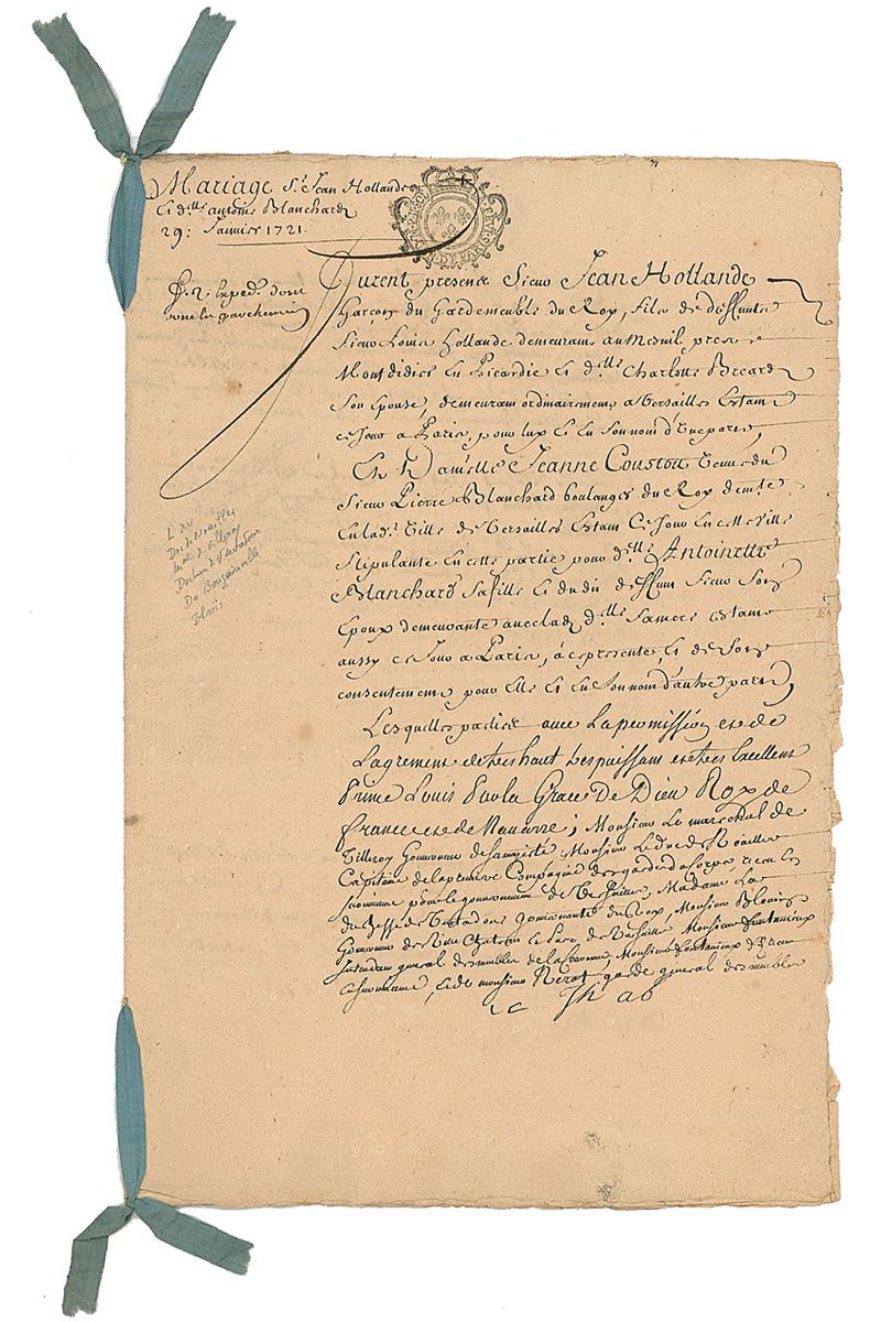 Ineffectual King of France from 1715 to 1774 who was dominated by his strong-willed and unscrupulous mistress, Madame de Pompadour. DS, in French, signed “Louis,” eleven pages on six sheets, 9 x 13.25, January 29, 1721. Rare marriage contract signed by the king and some 25 nobles and officials, for Jean Hollande, member of the King’s Guard, and Antoinette Blanchard. Among the signataries are the Duke of Villeroi, governor of Louis XV and the King’s life-long friend; the Duchess of Ventadour, the King’s governess until 1717; the Duke of Noailles. Marshal of France Pierre-Yves de Bougainville, notary and member of the King’s Council and father of the explorer Louis-Antoine de Bougainville, has signed twice at the end. A couple small pencil notations, and some scattered light soiling and ink marks, otherwise fine condition.
