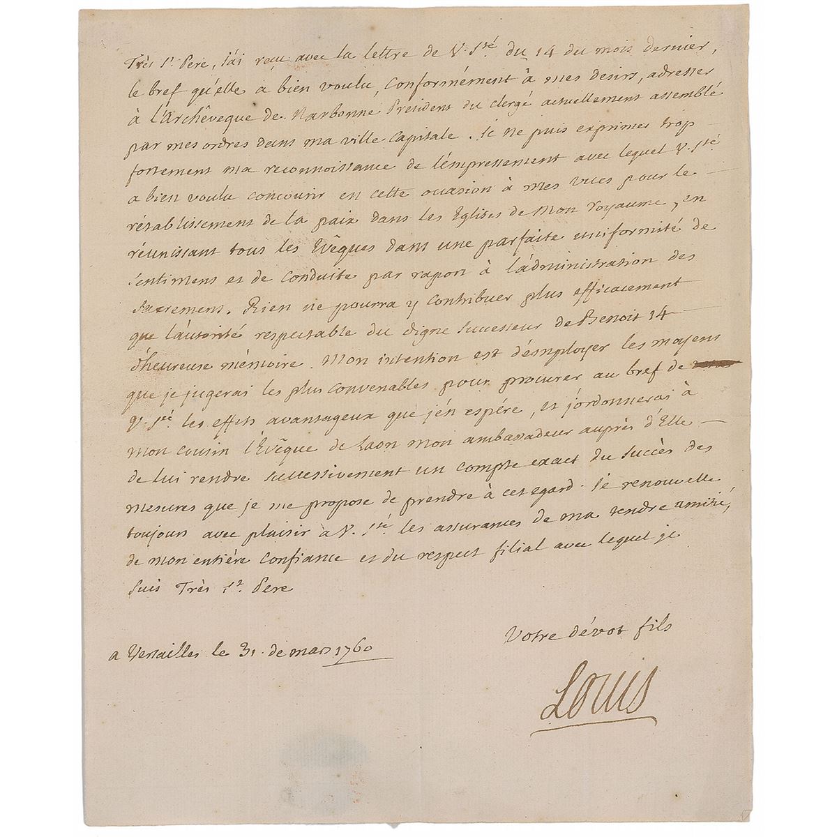 LS in French, signed “Louis,” one page, 7.5 x 9, March 31, 1760. Letter sent from Versailles to Pope Clement XIII, in full (translated): “Holy Father, I have received the letter from Your Holiness of February 14 and the papal brief that you have sent, according to my desire, to give to the Archbishop of Narbonne, president of the Clergy presently assembled in my capital city.