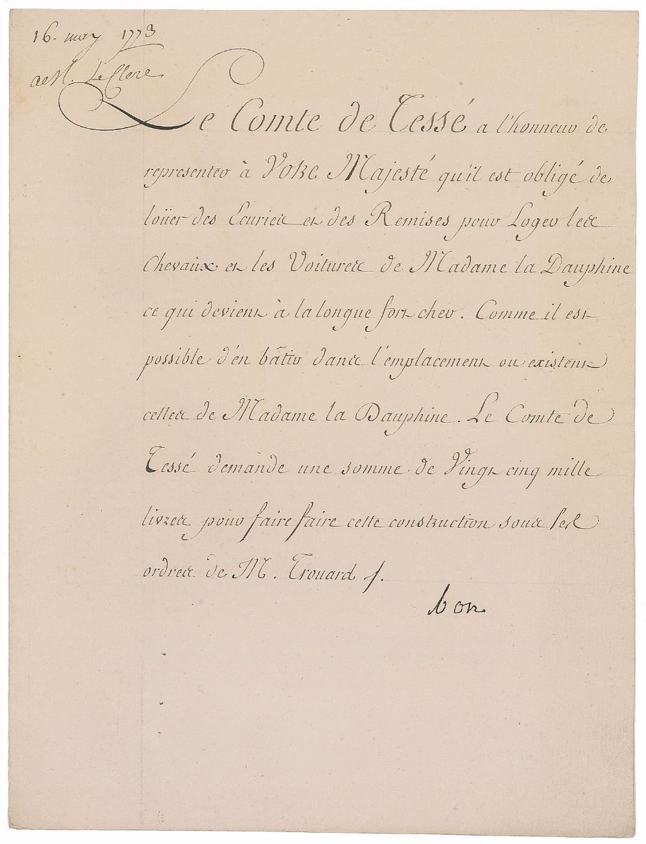 Ineffectual King of France from 1715 to 1774 who was dominated by his strong-willed and unscrupulous mistress, Madame de Pompadour. Manuscript DS in French, signed “bon,” one page, 7.25 x 9.5, May 16, 1773. King Louis XV approves a request from the Count de Tesse for a budget for horses and carriage for the service of “Madame le Dauphine,” Marie Antoinette. Boldly approved at the conclusion by King Louis XV. In fine condition, with pin holes to lower left. Accompanied by an additional document regarding the construction of horse stables, again for Marie Antoinette. Marie Antoinette was the wife of Louis XVI, heir to the French throne, who assumed power as king after his grandfather Louis XV passed away on May 10, 1774.