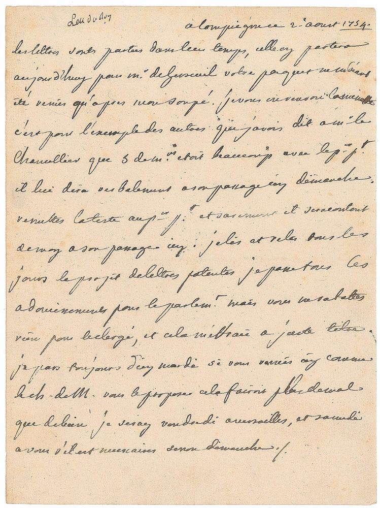 Ineffectual King of France from 1715 to 1774 who was dominated by his strong-willed and unscrupulous mistress, Madame de Pompadour. Handwritten letter in French by King Louis XV, unsigned, one page, 6.5 x 8.5, August 2, 1754. Letter to the Chancellor de Lamoignon, in part (translated): "Give the [test] to the first president [Rene-Charles de Maupeou, first president of the Parliament of Paris] and he will probably be happy with me when he comes here. I read again and again, every day, the draft bill about the letters patent, I agree with all the alleviations for the Parliament; but you are not cutting off anything for the Clergy, and I am rightly worried about it. I always leave from here on Tuesdays; your coming here would do more harm than good. On Friday I will be in Versailles, and we can meet on Saturday if necessary." In fine condition.