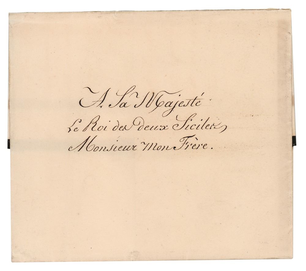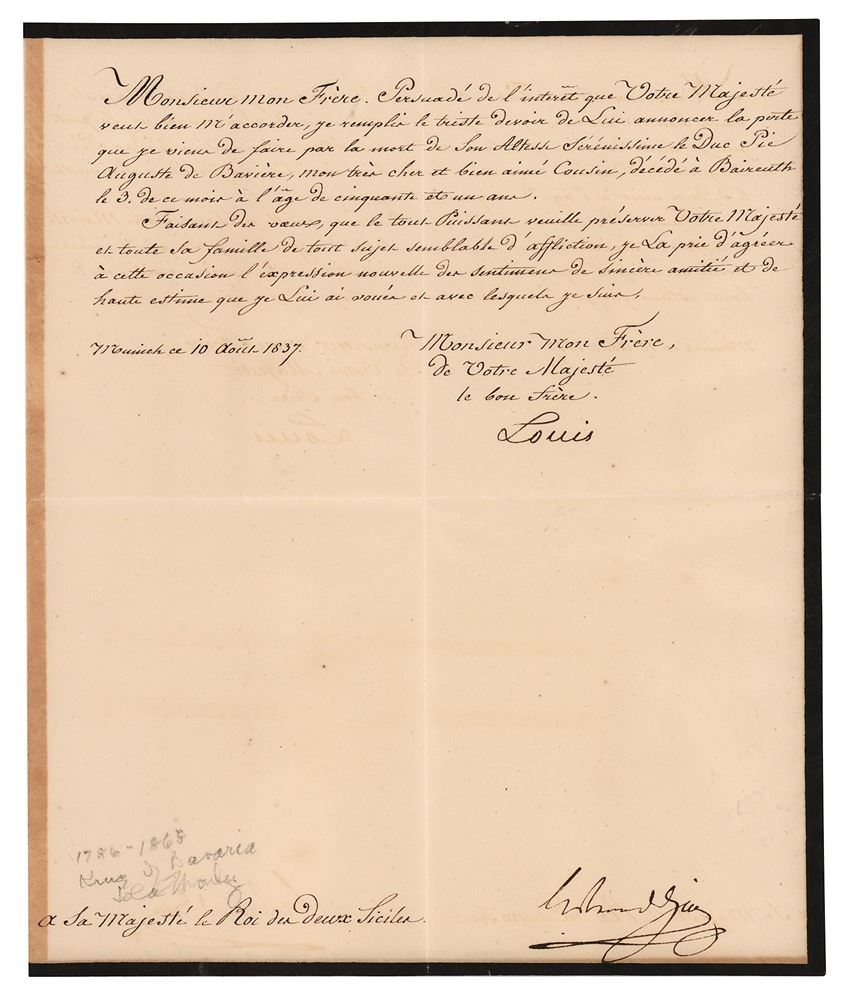 LS in French, signed "Louis," one page on 8 x 9.5 black-bordered mourning stationery, August 10, 1837. Letter to the King of the Two Sicilies, announcing the death of his cousin, the Duke Pius August of Bavaria. In fine condition, with a thin strip of toning along the left edge. Accompanied by the original transmittal envelope. A desirable piece of royal correspondence.
