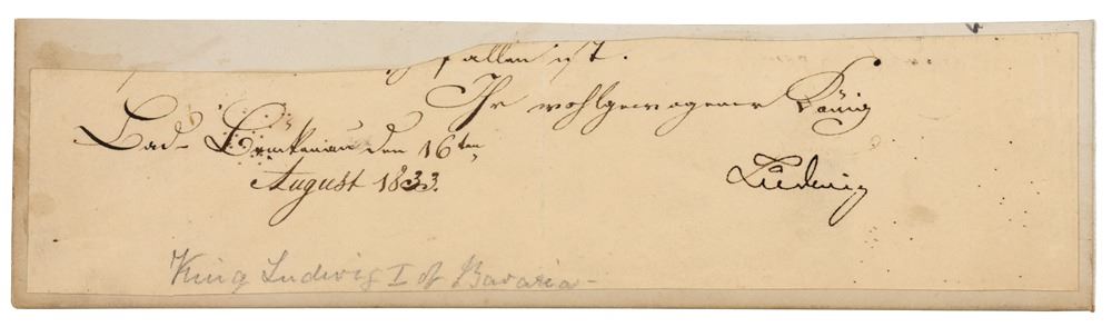 Ink signature of King Ludwig I of Bavaria, "Ludwig," on an off-white 6.5 x 1.5 slip clipped from a document dated to August 1833. Affixed to a slightly larger mount and in fine condition.