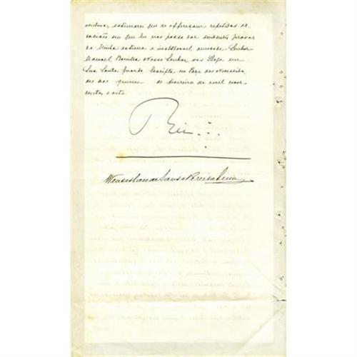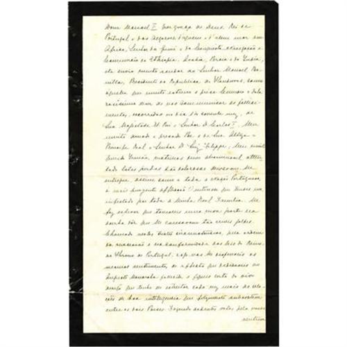 <B>King Manuel II of Portugal Document Signed,</B></I> four integral pages written on pages one and two, 9.5" x 15.5", February 1908, in Portuguese. Light foxing, a couple of minor tears and an uneven left edge where it was removed from a binding, else very good. The document is addressed to General Miguel R. Davila, President of the Republic of Honduras, informing him of the assassination of King Carlos I of Portugal and the accession of King Manuel. The first page is bordered in black to denote court morning. It is signed boldly on the verso "<I>Rei</B></I>".<BR><BR><b>Shipping:</b> Flat Material, Small (<a target="_blank" href="http://www.heritageauctions.com/common/shipping.php">view shipping information</a>)