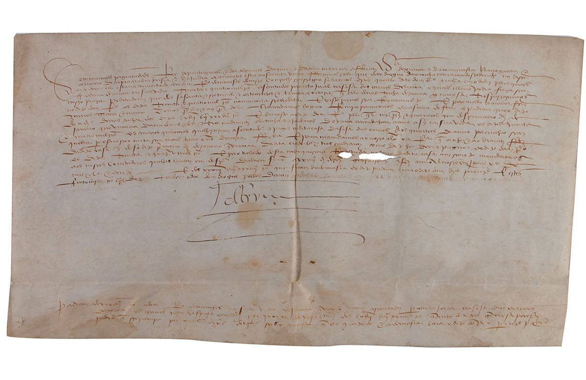 King of Portugal, born in 1469, who ruled from 1495–1521). Manuscript vellum DS, in Spanish, signed “El Ray,” one page, 16.25 x 9.25, 1502. A document decreeing Don Diogo de Noronha to pay his father-in-law, Don Diego Meneses an annual pension of 24,000 reis. In very good condition, with intersecting folds, several small holes, a couple lightly affecting a few words of text and scattered soiling.