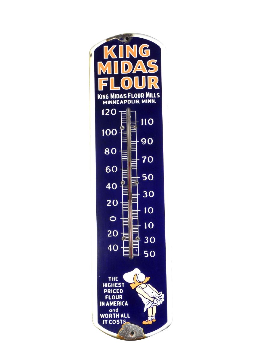 King Midas Flour Porcelain Thermometer. Minneapolis, MN. Chipped at top and bottom and some staining around the edges otherwise good condition. 7 X 27 1/4 inches.