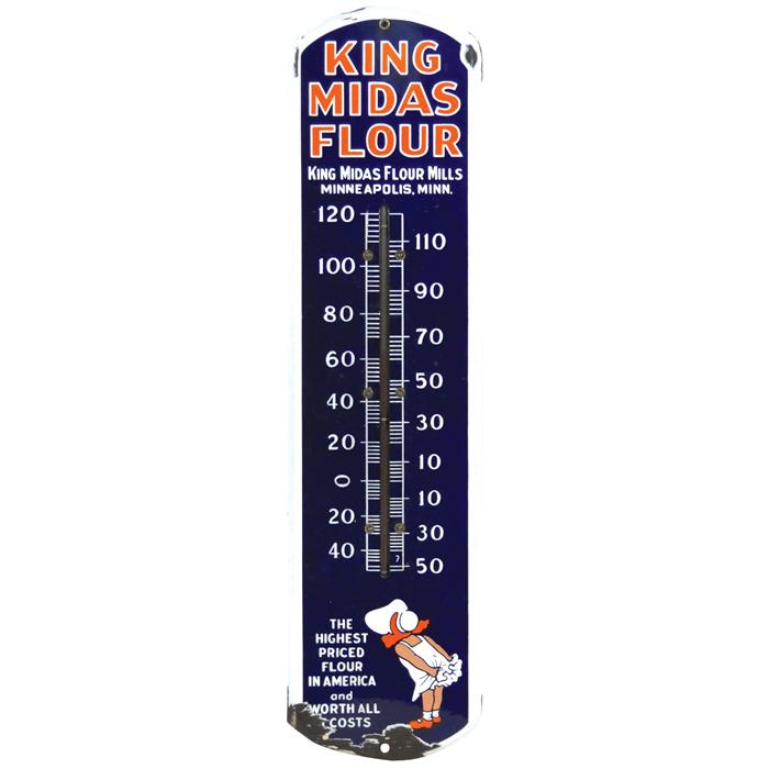 King Midas Flour porcelain thermometer from King Midas Flour Mills, Minn, MN, Good cond w/significant loss in porcelain at bottom, 27.25"H x 7.25"W.