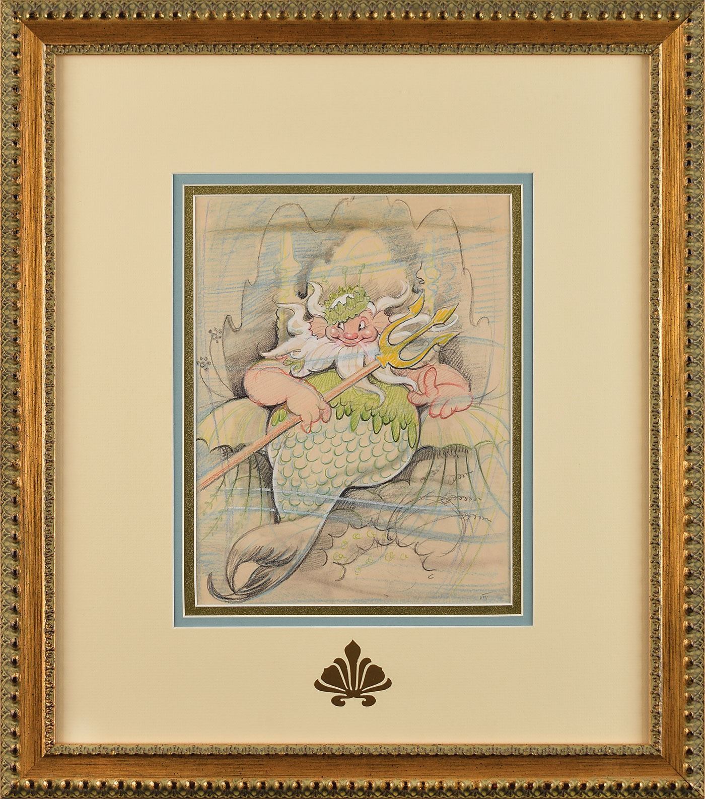 (Walt Disney Studios, 1938) Original pre-production concept drawing of the title character from the Silly Symphonies cartoon King Neptune, which depicts the great bearded sea-god holding his trident and seated on his underwater throne. Accomplished by artist Ferdinand Horvath in graphite and colored pencil on 7.75 x 10 artist paper, with Horvath signing his initials in the lower right. Handsomely triple-matted and framed to an overall size of 17 x 19.5. In fine condition. Accompanied by a certificate of authenticity from Animation Plus Gallery.