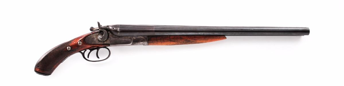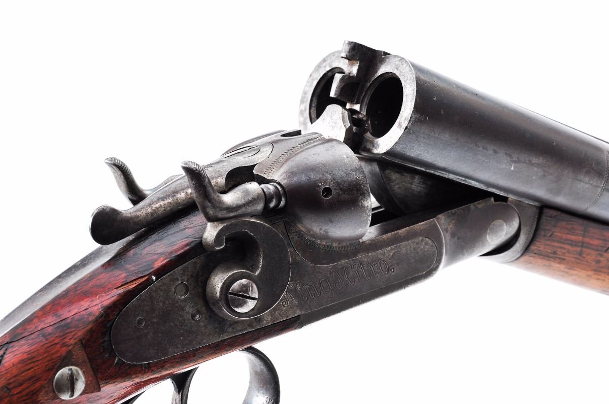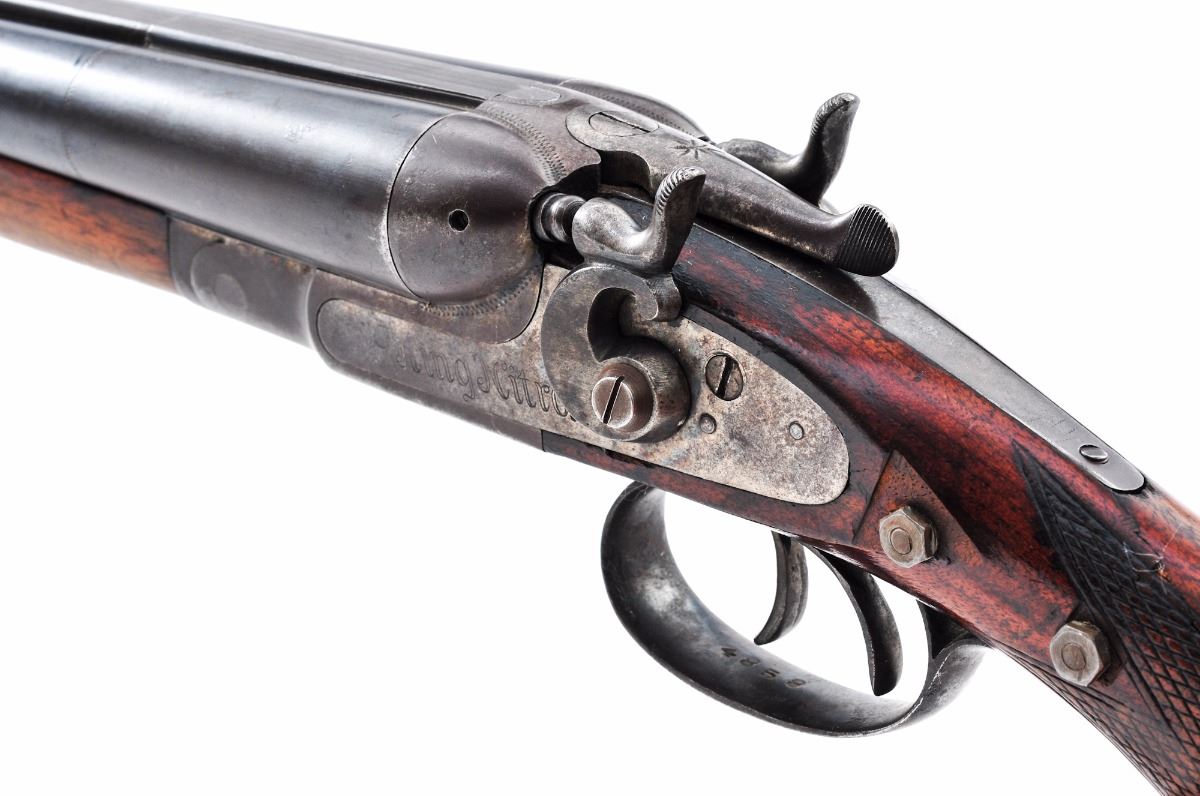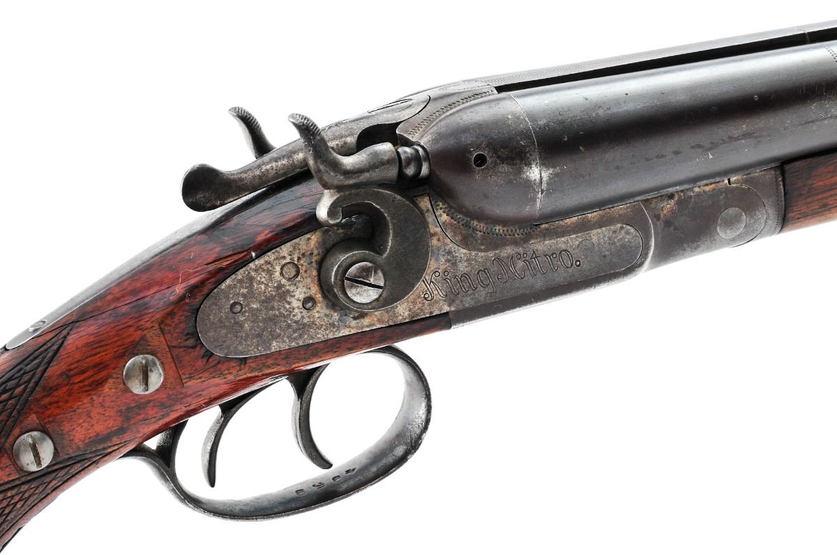 King Nitro Side-by-Side Shotgun, #4858, 16 ga., 18-3/4'' barrels, brown finish, checkered walnut stocks. Mfg'd ca. 1890. Condition is good overall. Finish has turned a uniform brown with very light surface corrosion in spots. Buttstock has been cut to an overall length of 27-1/2'' and is now secured by two crossbolts. Action is tight, bores are rough. Est.: $100-$200. (Antique)