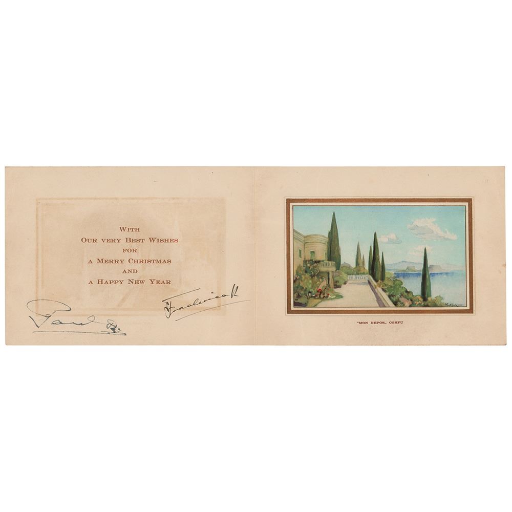 King of Greece from 1947 until his death in 1964. Nice Christmas card with a royal monogram on the front, measuring 16.5 x 6 open, signed below a printed greeting in fountain pen, "Paul R" and "Frederica R." An attractive illustration of Mon Repos, Corfu, is affixed on the opposing side. In very good to fine condition, with light creasing and soiling, and offsetting of the facing image touching the signatures.