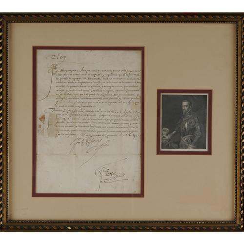 <B>King Philip II of Spain Document Signed </B></I> <I> "Yo El Rey." </B></I> One page, 8.25" x 11", np, September 22nd, 1557. This document was written in the year 1557, the second year of his reign. He was the first person to officially use the title, King of Spain. Philip's reign was dotted with spots of success and failure; among the successes were the acquisition of Portugal and expansion of the Spanish empire in the America's and Africa. This letter, in part, deals with one city in Africa called Oran. Oran is a city in Northwestern Algeria; the Spanish captured it in 1509 under Cardinal Cisneros. They held control over the city and province till 1708 when the Ottomans seized it. This document discusses a message he received on the 30th of August and states that he sent a messenger right away to the Cardinal of Alexandria about the success they were having in Oran with the Turks and Moors. The general tone of the letter is one of concern and dutifulness. He requests that the receiver remain vigilant and continue to do his service for the security and sanctity of the empire. A very legalized document with some archaic language; but the content is interesting as it deals with Spanish colonies and the legal nature in which these were handled. <BR> The document is in fine condition; usual folds are present; soiling present on fold lines; small area of foxing on the right edge near the center. <BR><BR><B>Important notic